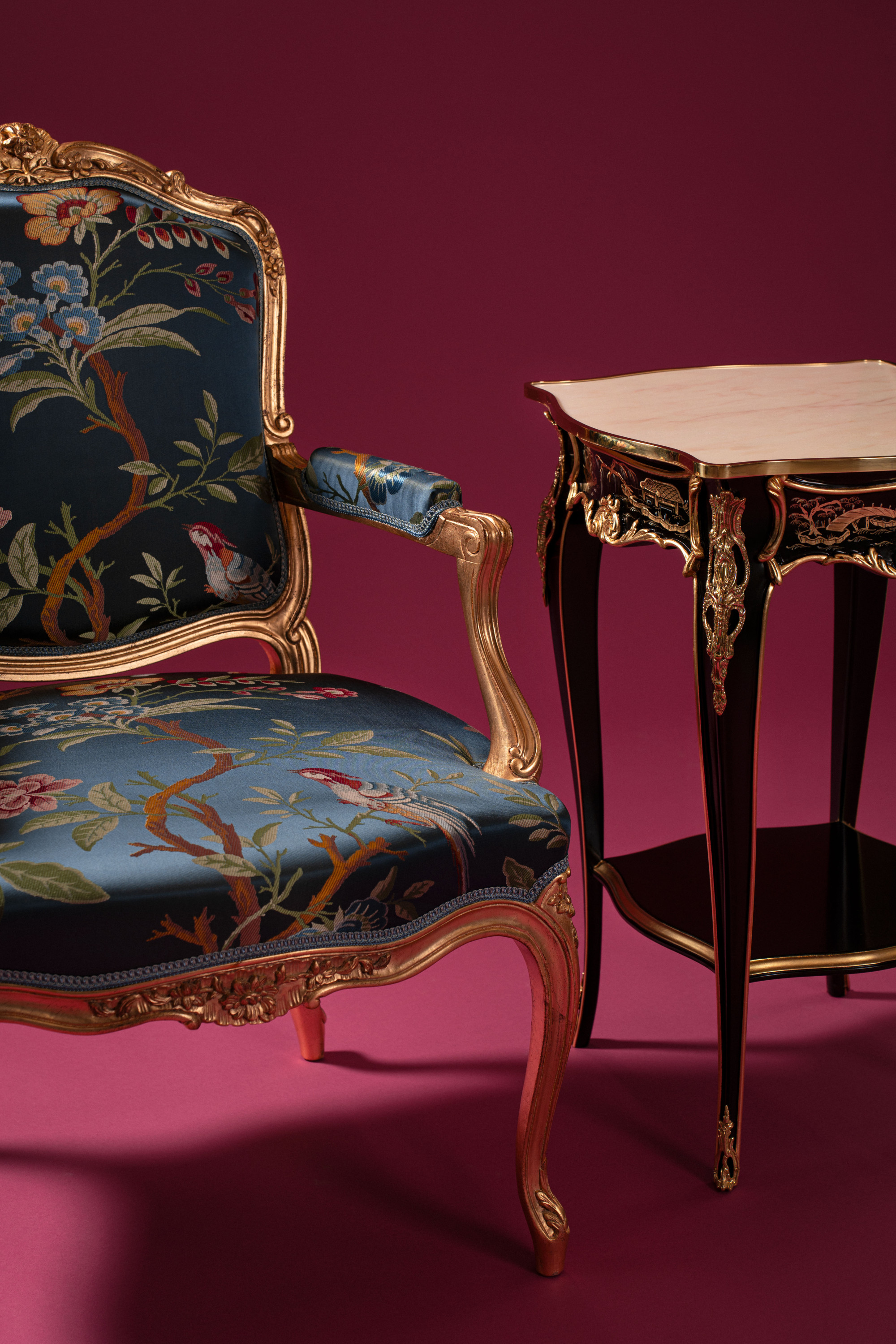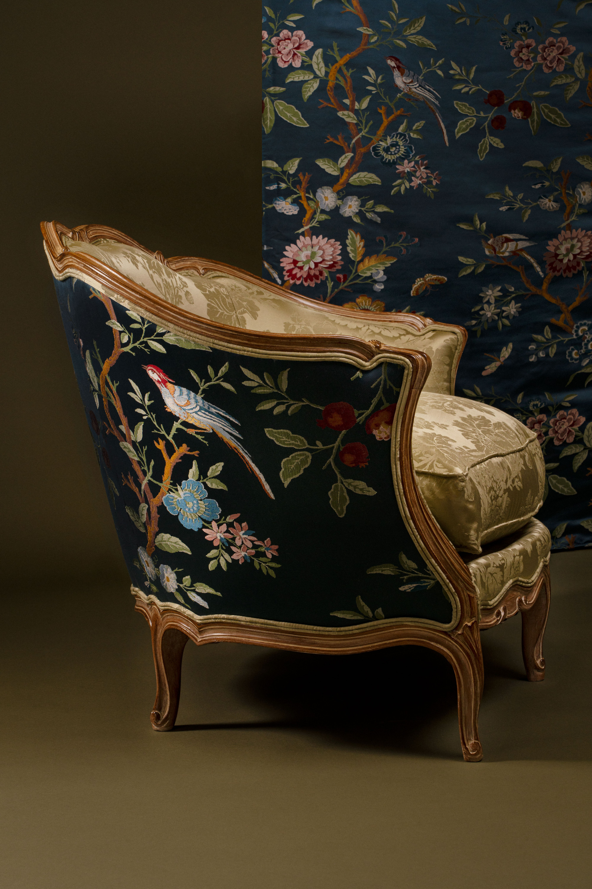 Ce magnifique lampas fut mis au point en 1866 à partir d un dessin japonais par Grand Frères alors détenteurs de la manufacture de tissage depuis le début du siècle. Son dessin d arbre de vie, luxuriant de fleurs, fruits et oiseaux multicolores, s' épanouit en 2 chemins sur un raccord imposé à la coupe, de 87 cm de hauteur. On y retrouve la fraîcheur et la délicatesse du traitement, typiques des estampes et céramiques nippones importées en Europe dans cette deuxième moitié du 19ème siècle.