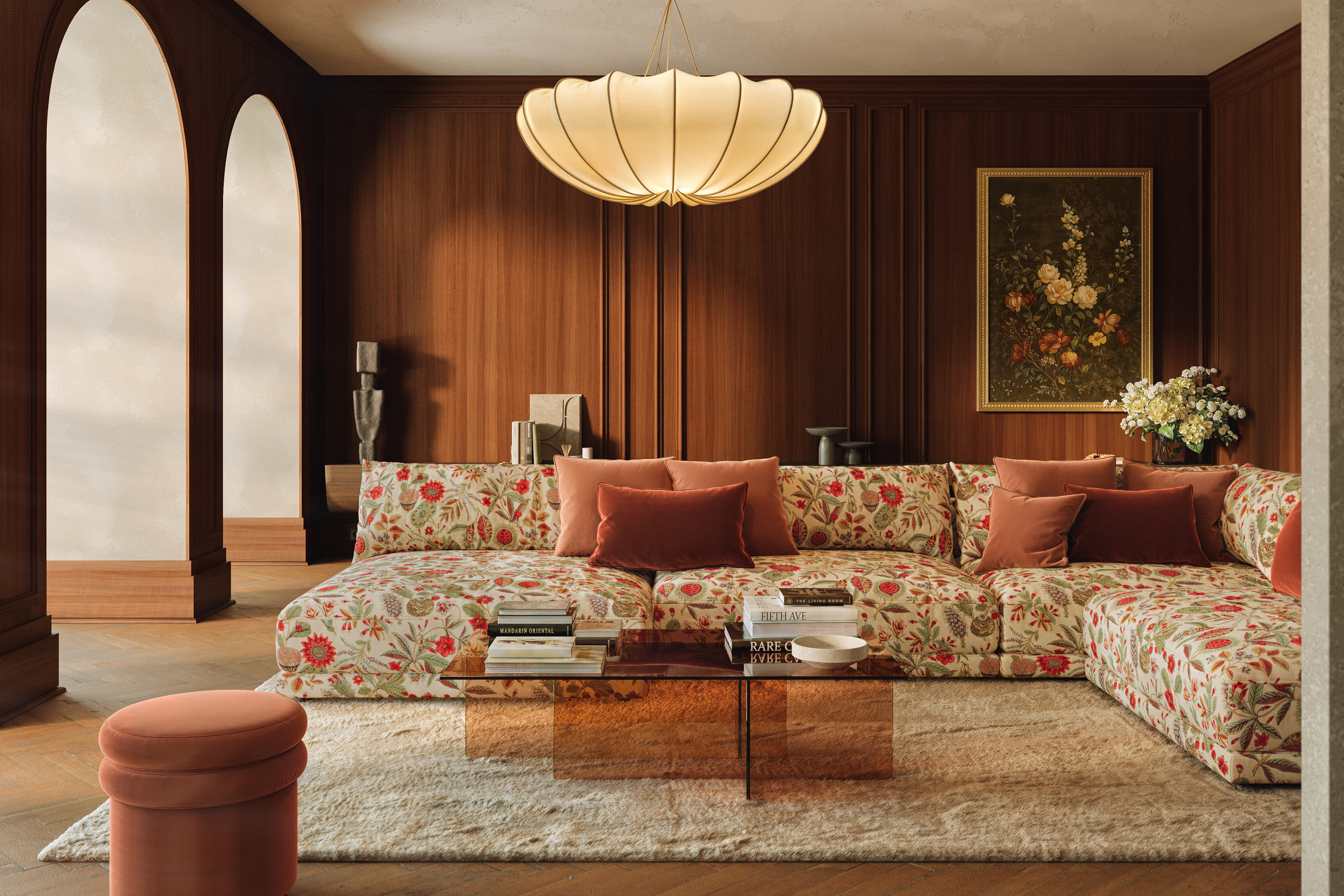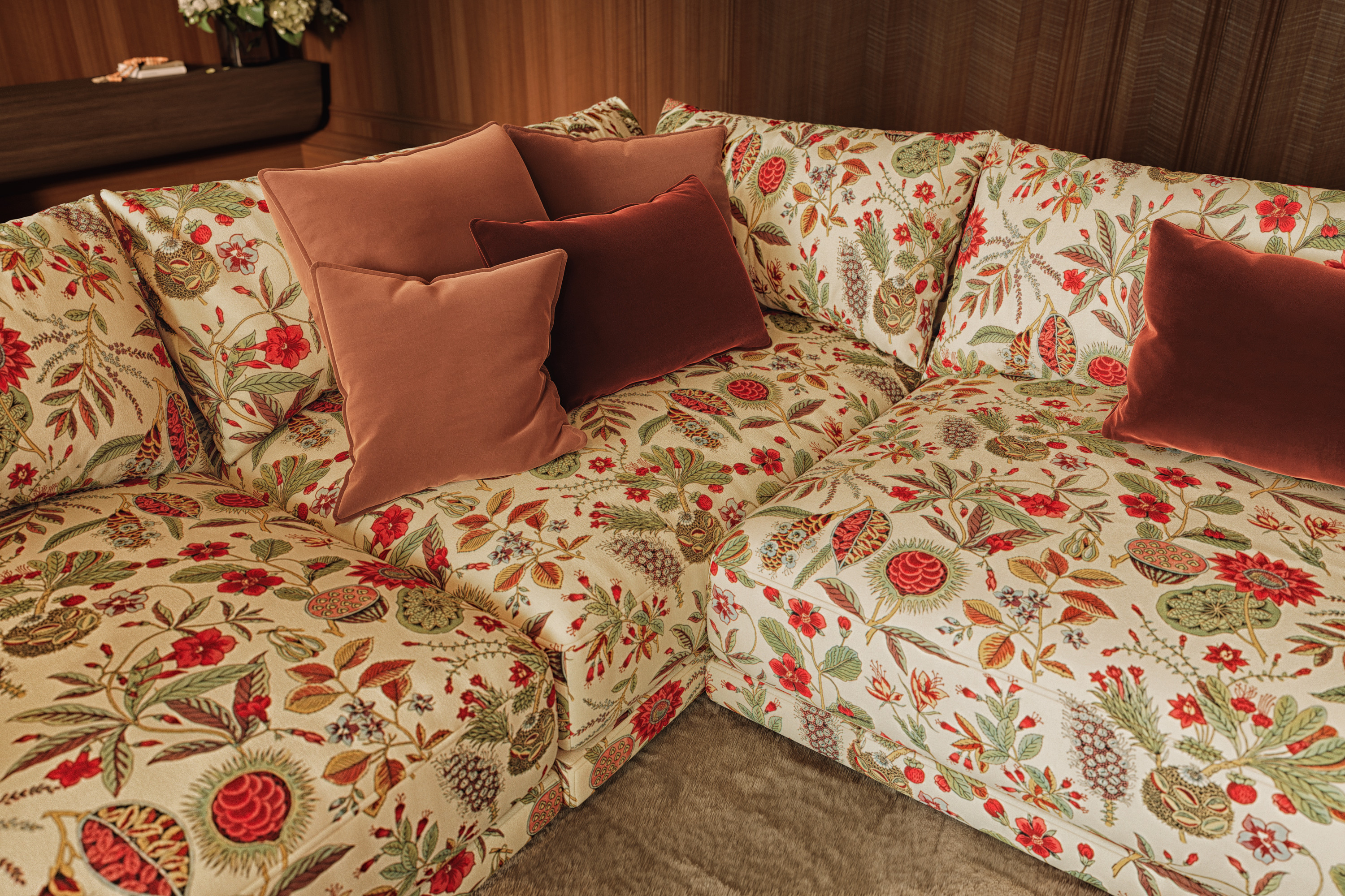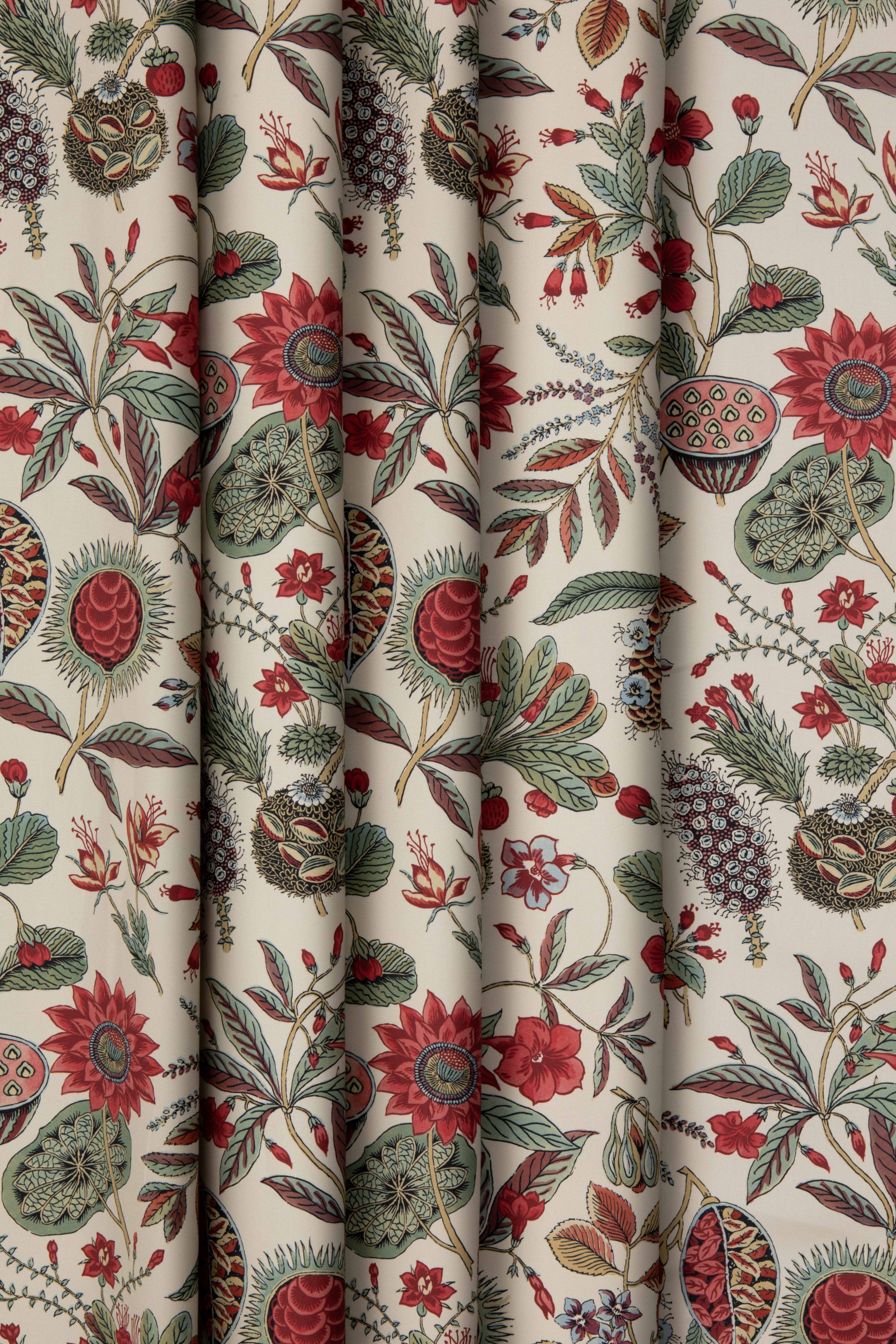 L'indienne LÉONIE, réédition d'une archive de 1795 de la Maison Lelièvre, présente sur une belle popeline de coton des motifs de fleurs et fruits exotiques stylisés, illustrant le goût des Européens pour l'exotisme à la fin du XVIIIe siècle. Alliant un style classique à une touche moderne, son élégance graphique et l'harmonie de ses couleurs apportent raffinement et fraîcheur à tout intérieur. Autrefois prisée par la noblesse dans les espaces intimes, cette pièce emblématique invite à redécouvrir la beauté des indiennes, ces étoffes légères qui illuminent les foyers avec leur botanique ornementale.