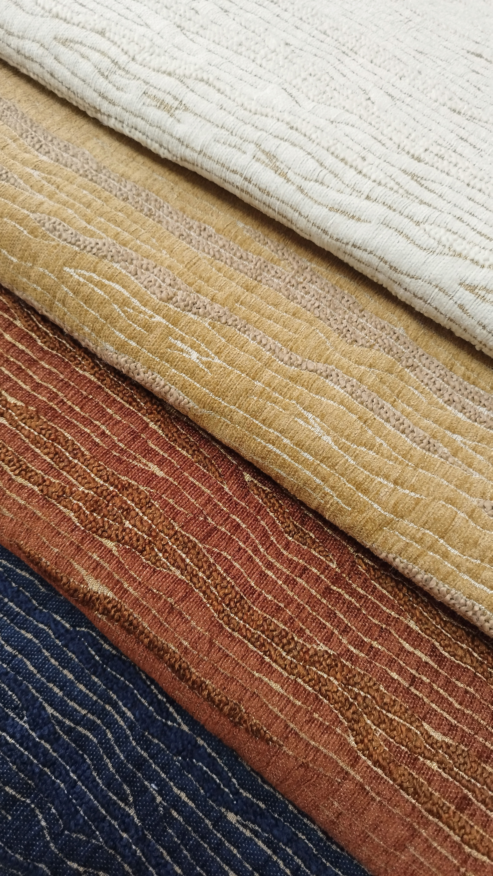 Entre écorce et fibre naturelle, MANIOC offre un jeu de reliefs et de reflets subtils. Sa texture chenille, ponctuée de fils scintillants, évoque la surface d'un tronc sculpté par le temps et la lumière.