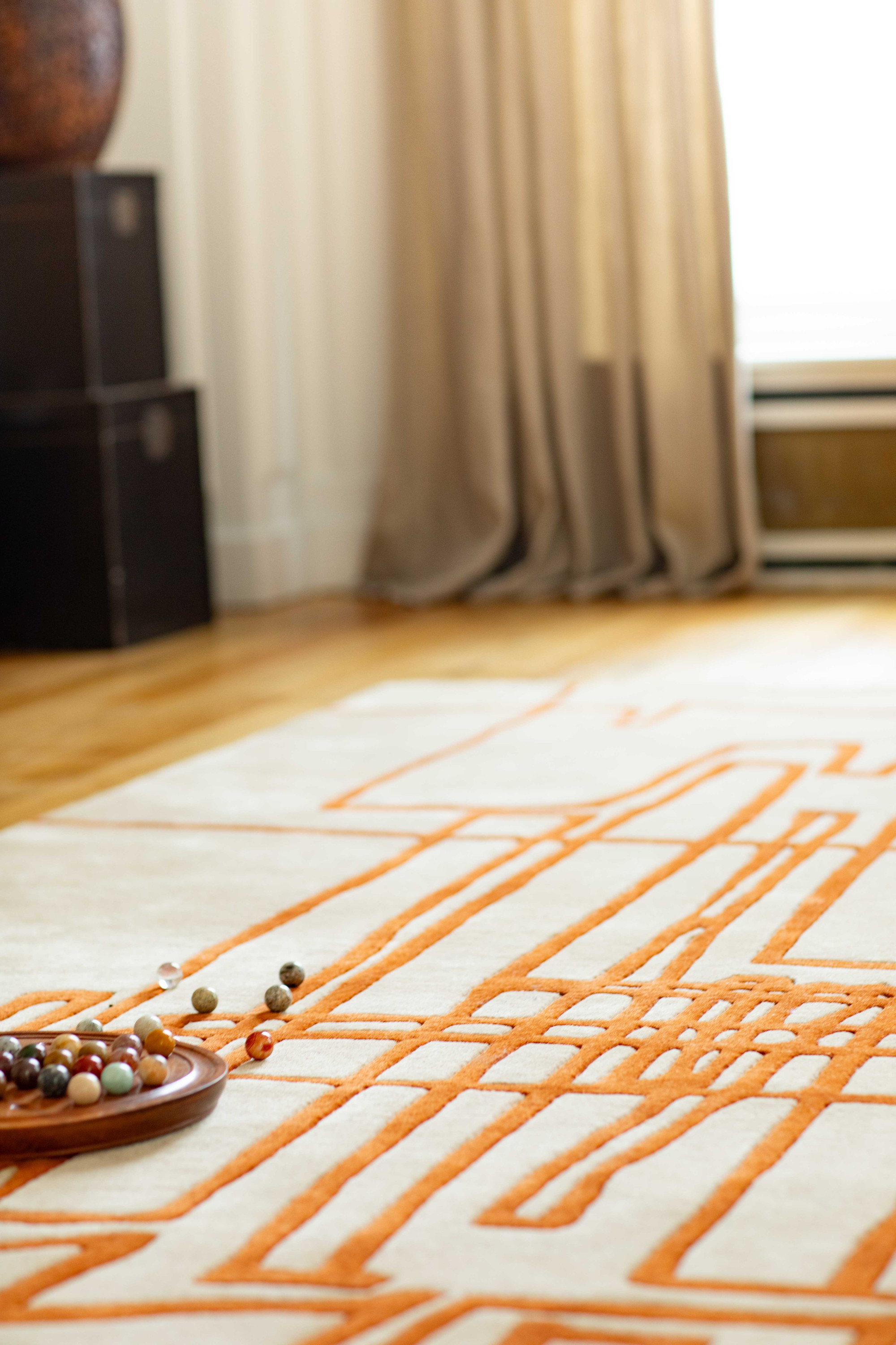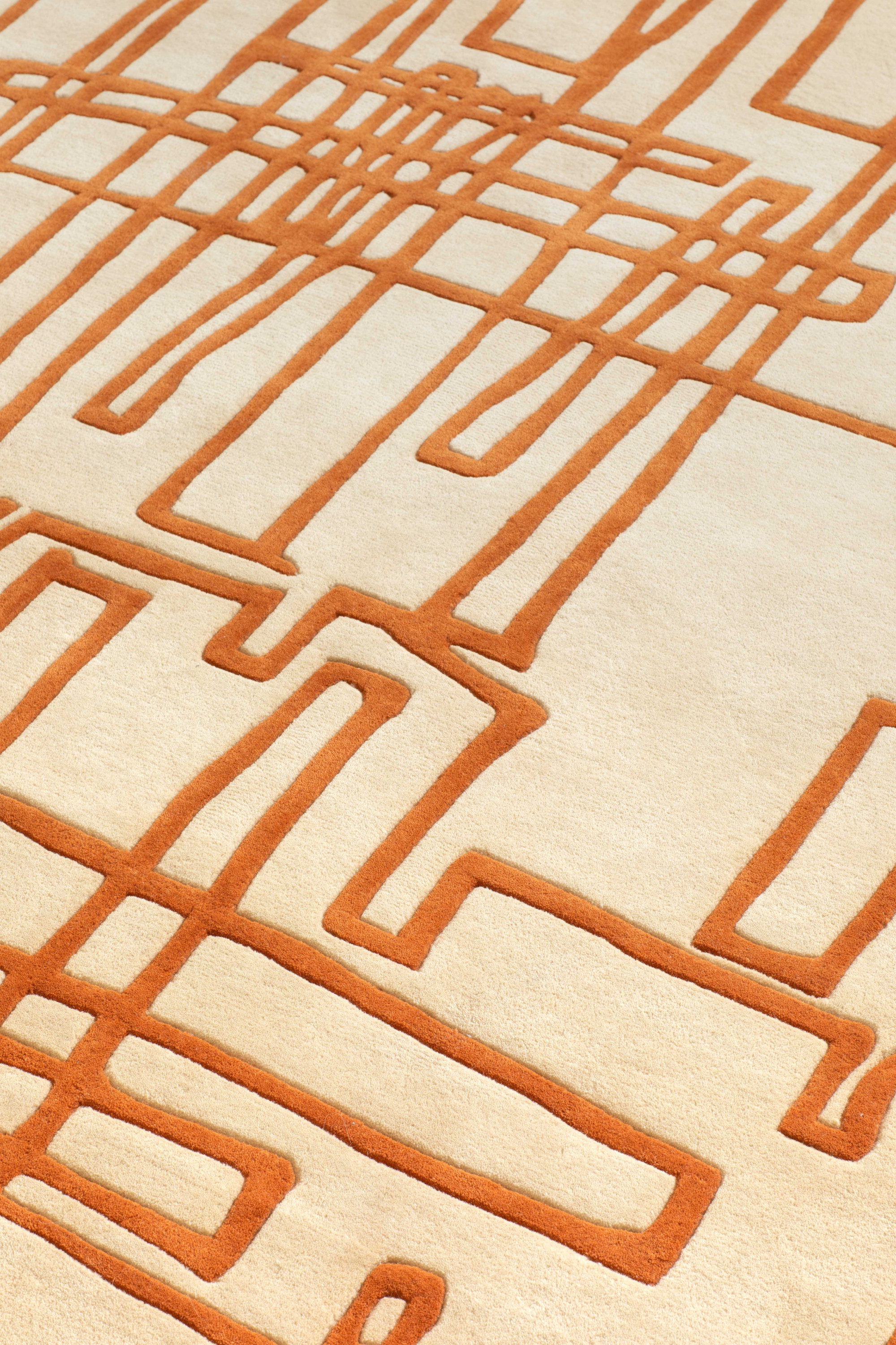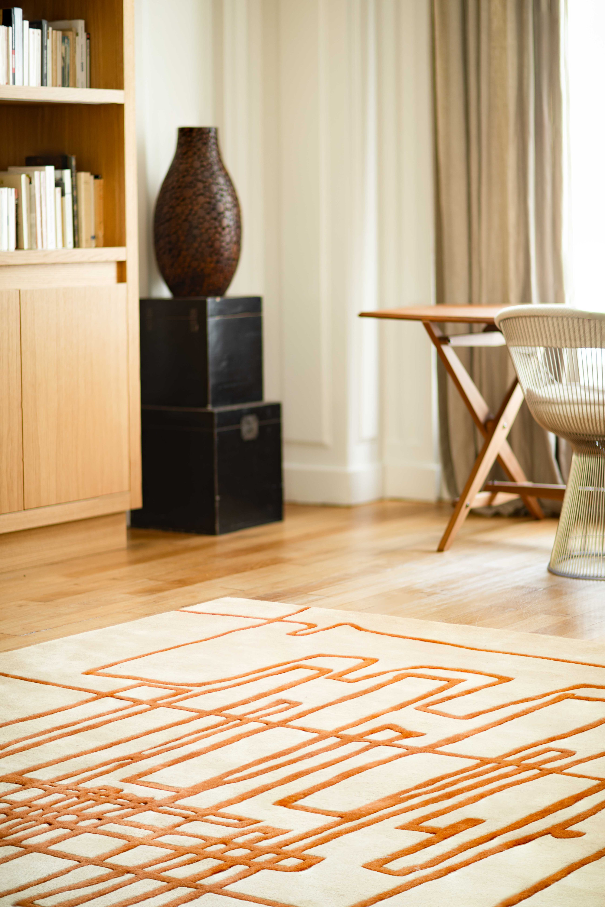 Composé à 100% en laine de Nouvelle Zélande, cette matière des plus résistantes offre un très beau rendu des couleurs. Le motif placé est mis en valeur par sa couleur chaude contrastée sur un fond beige, renforcé par une légère ciselure.