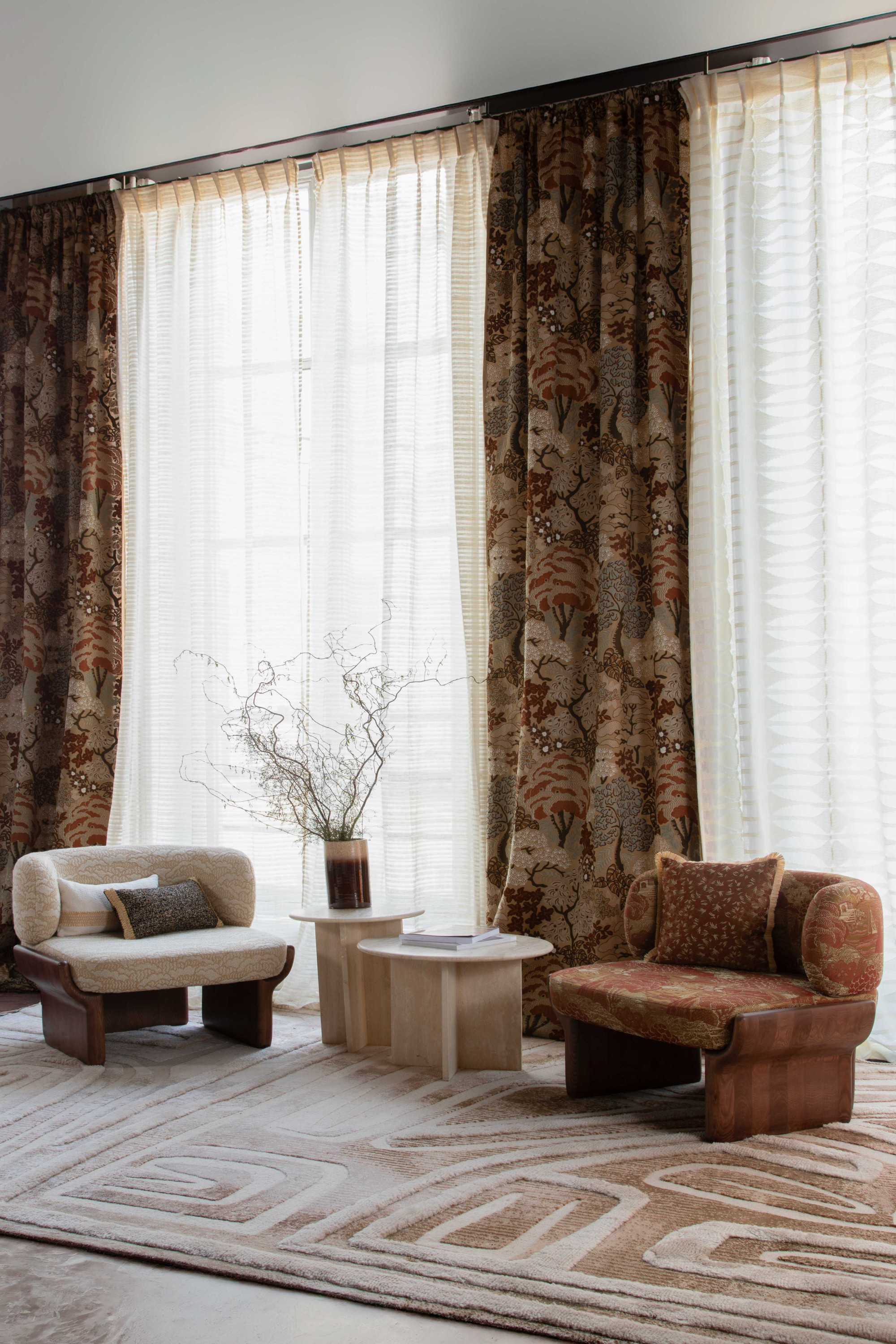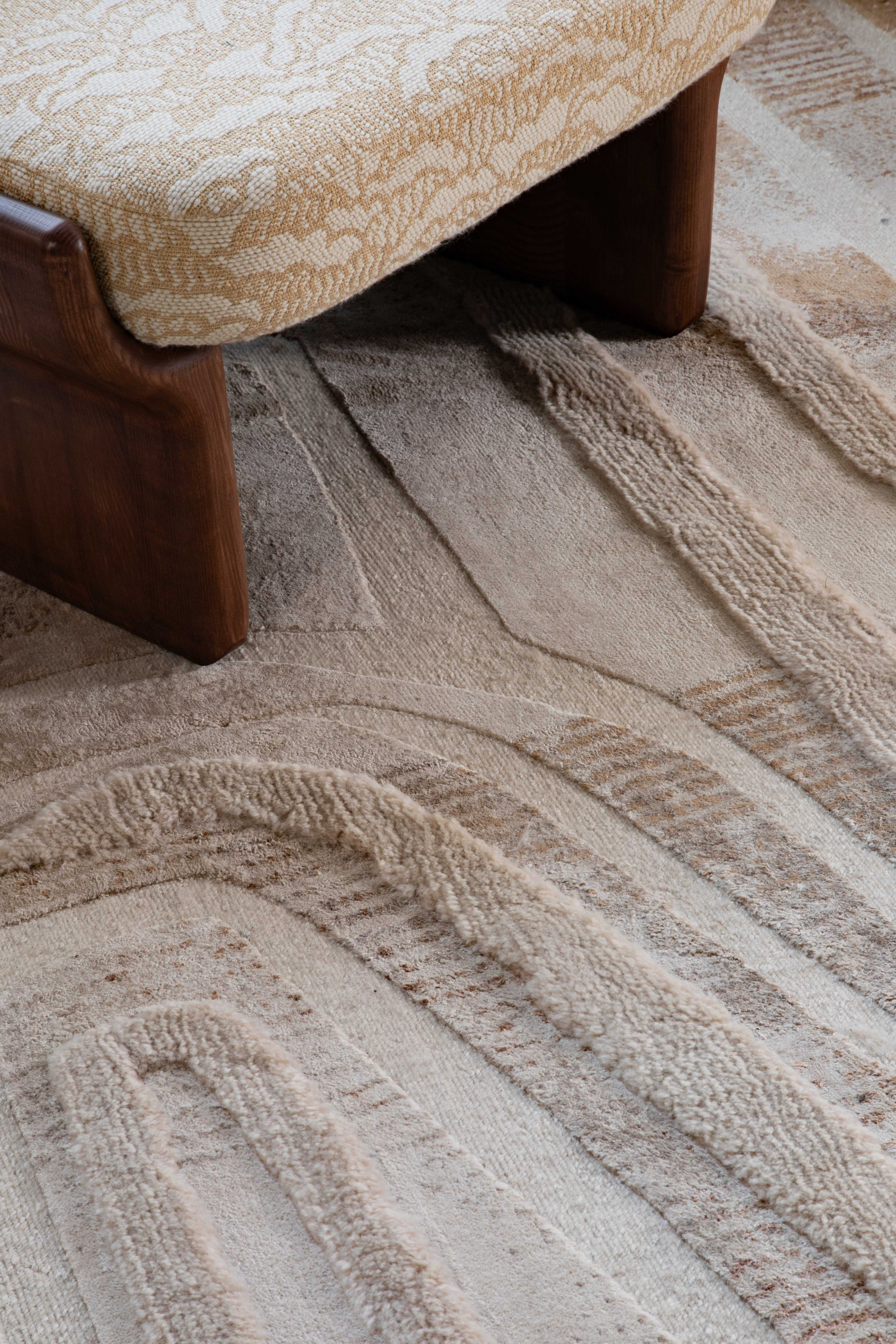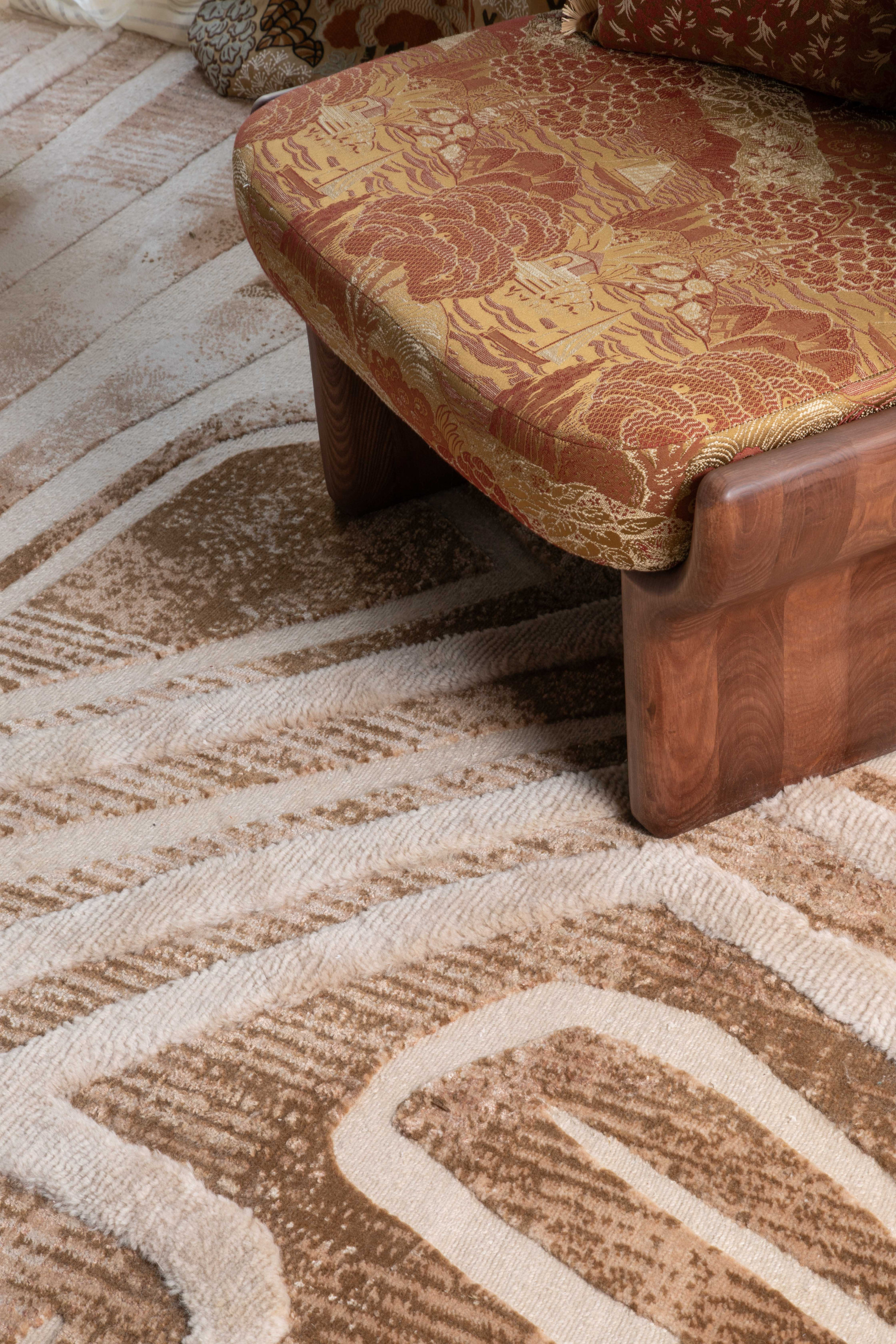 Tel un sillon traversant le désert, longeant vallées et plaines arides, le motif de ce tapis noué main se déploie avec poésie. Ce tapis impressionne par la richesse exceptionnelle de ses matières, qui lui confèrent un aspect d'une grande complexité : brillance et matité se répondent, où le duveteux et le relief se révèlent avec subtilité.