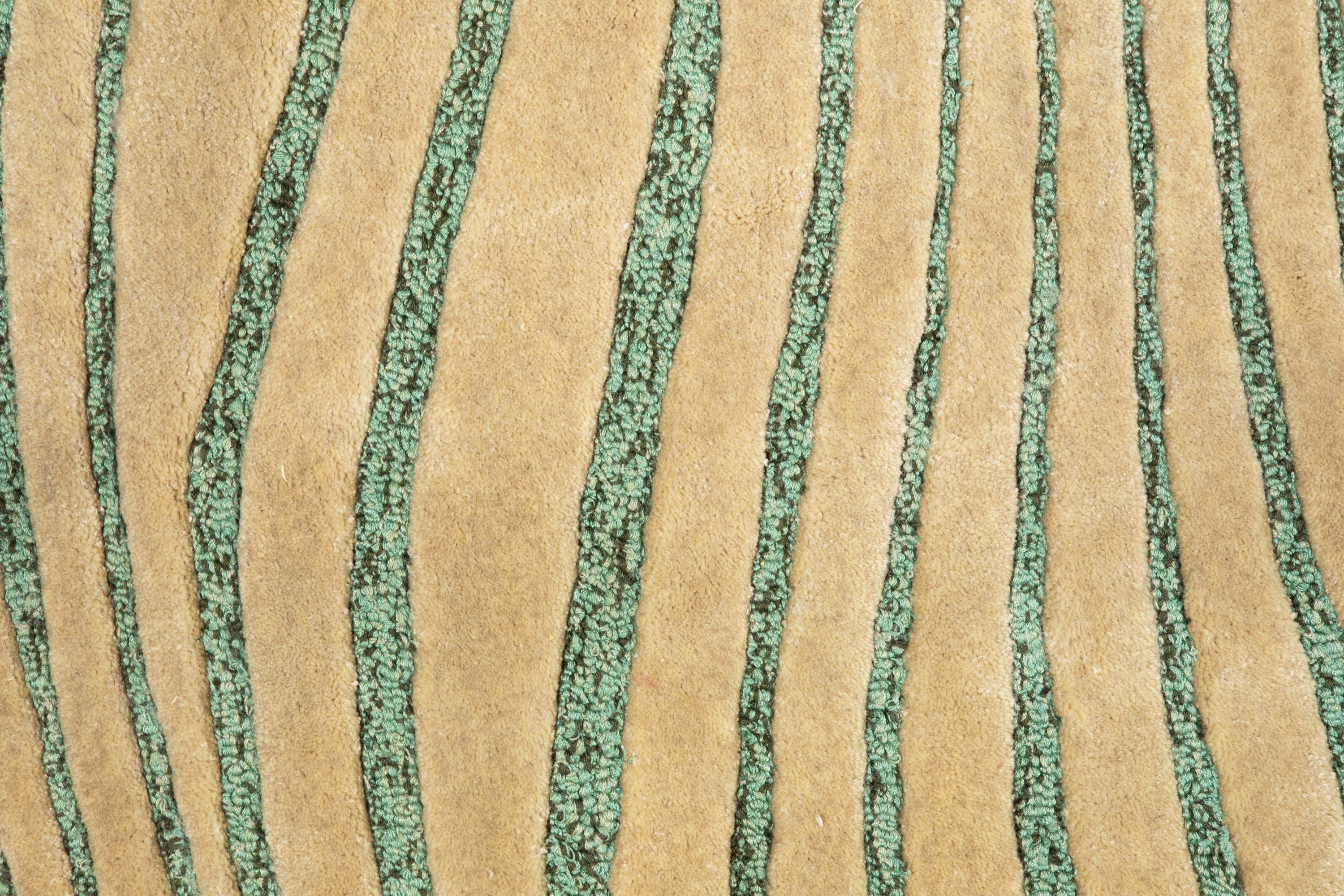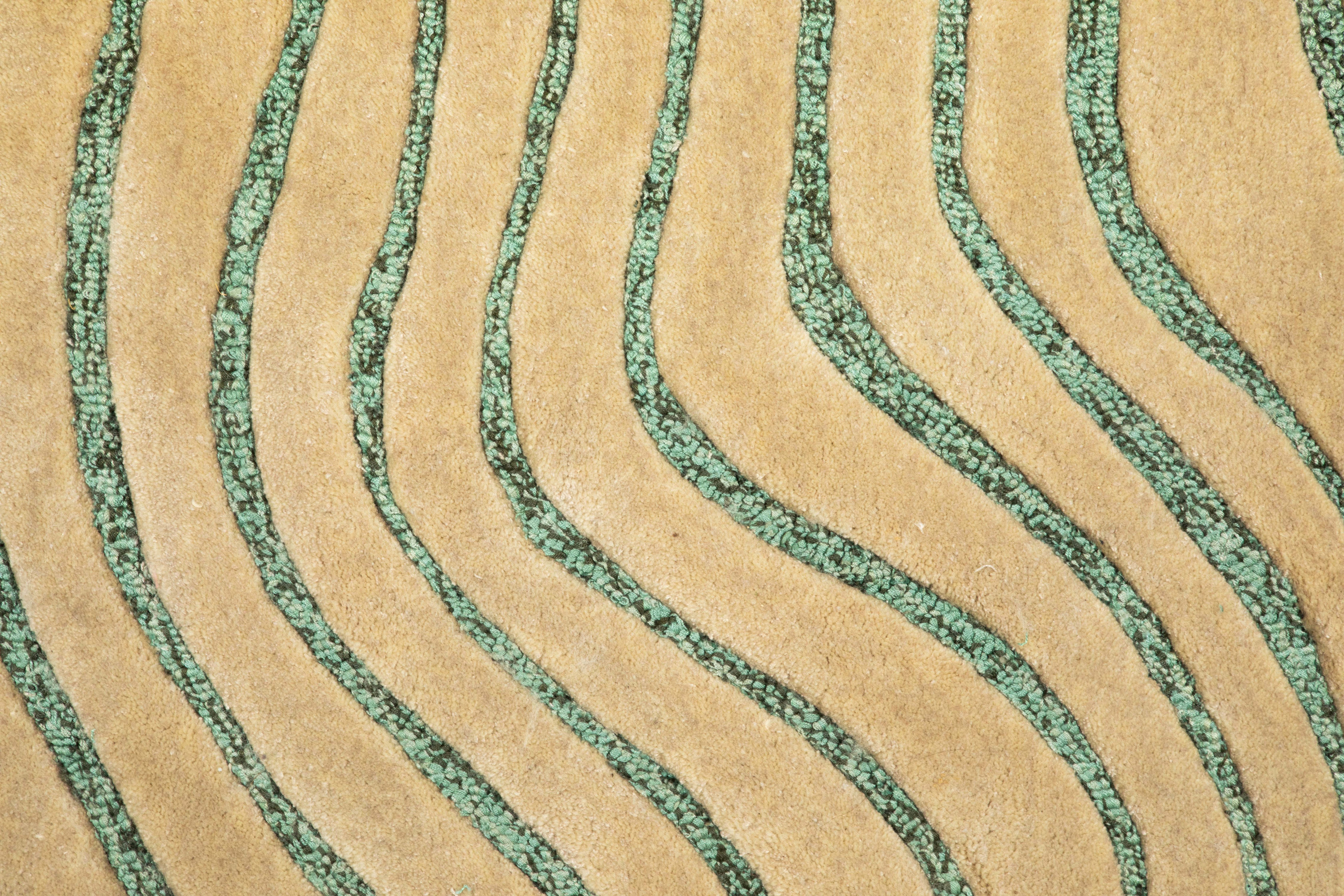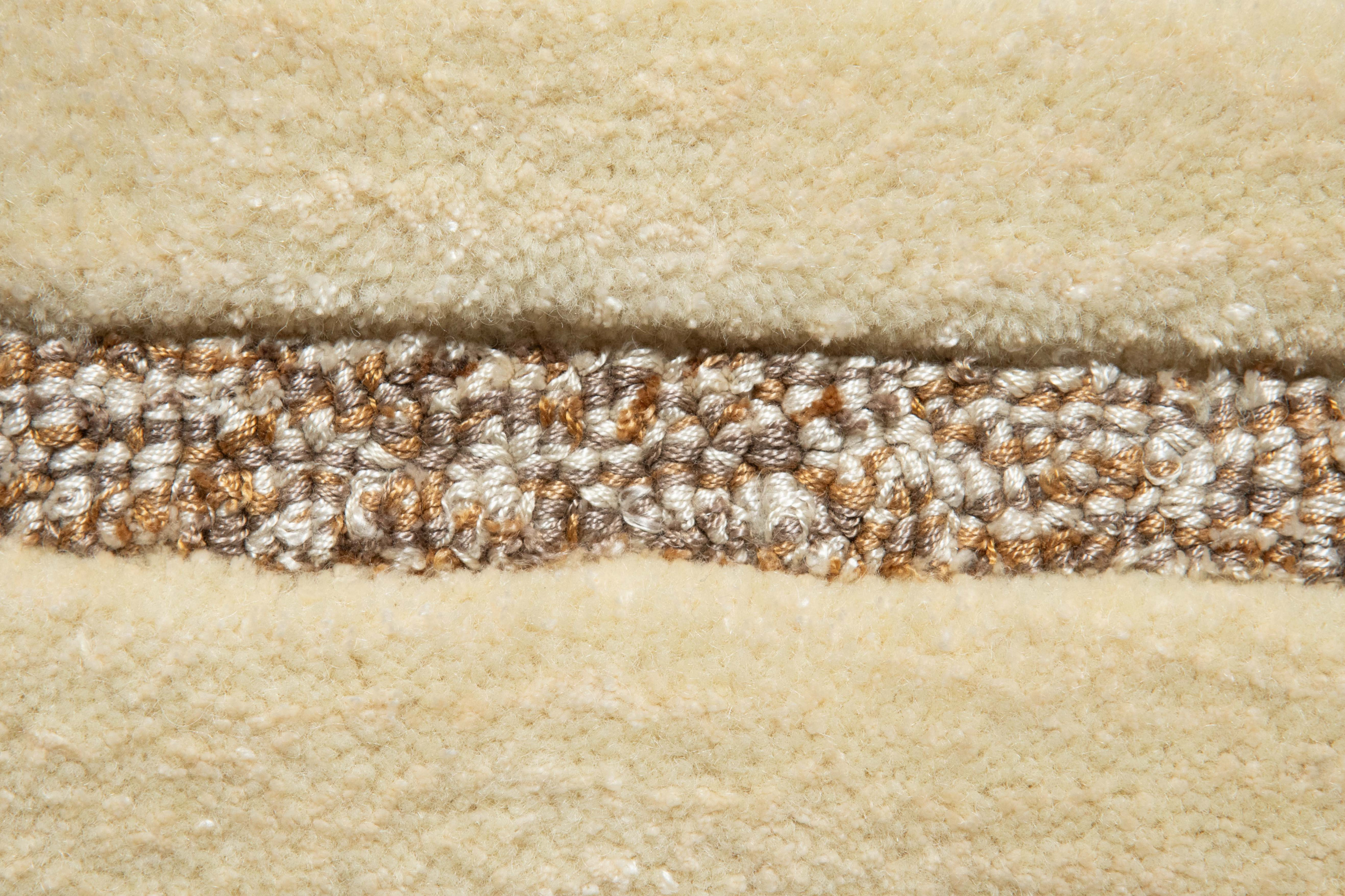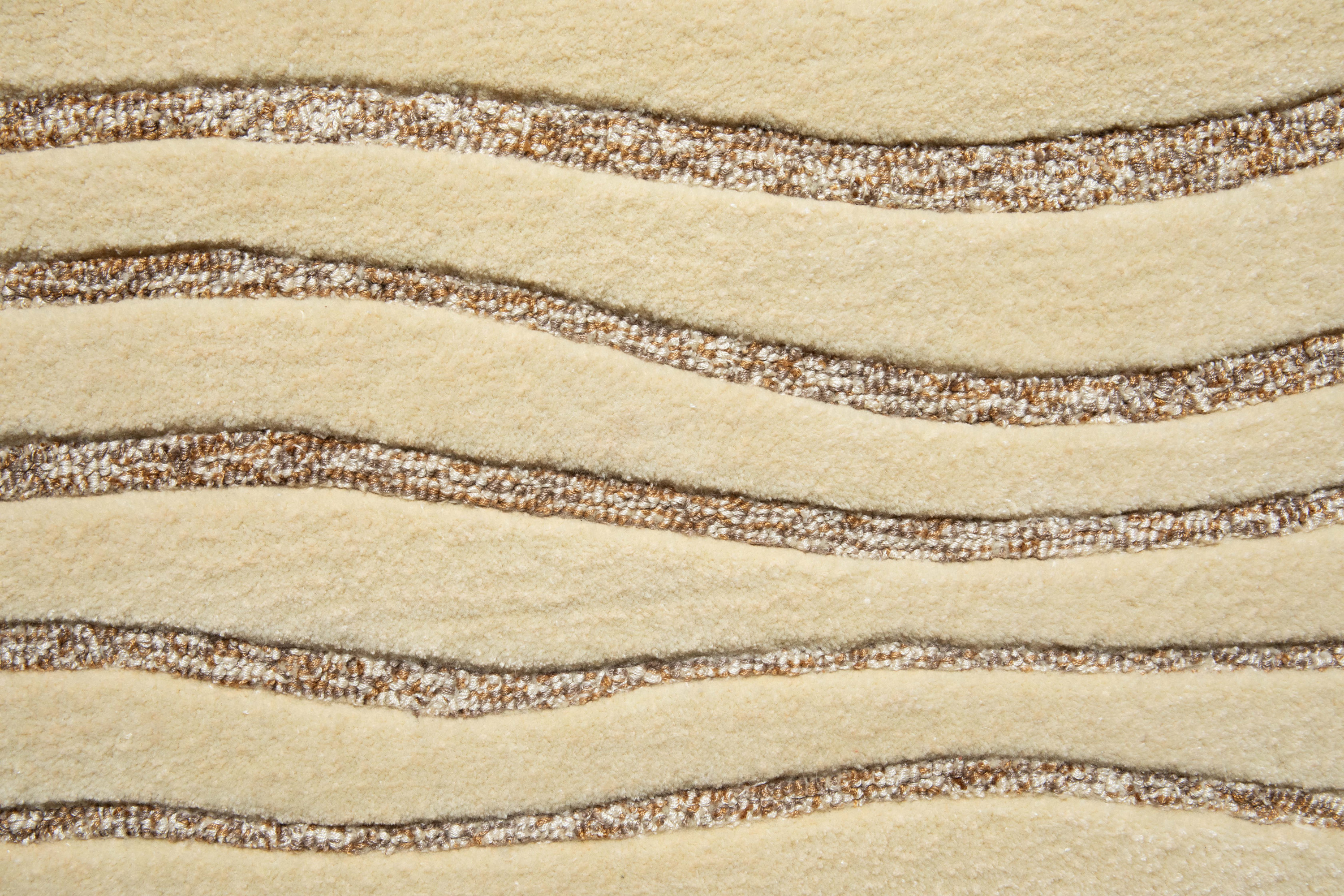 ONDES captures the subtle beauty of the channels left in the sand underwater, the discreet traces of the natural movements of the current. This hand-tufted rug evokes the play of shadows and light through the sheen of its background, where each wave reshapes the forms in the sand.