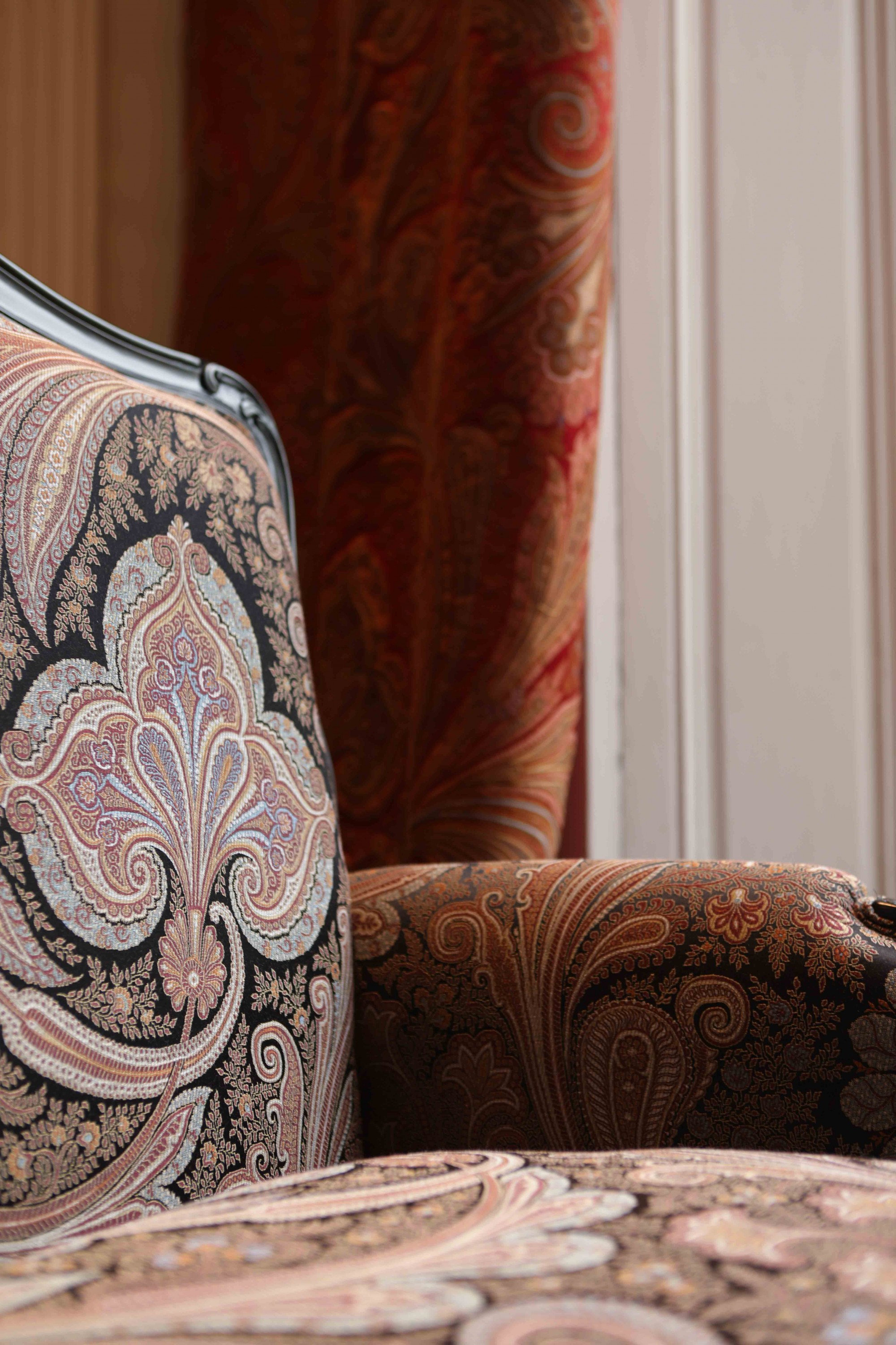 Le nouveau tissu de la collection Patrimoine a été entièrement imaginé autour du motif classique et iconique du même nom. Tissé dans la manufacture Lelièvre dans la région lyonnaise, cette étoffe précieuse aux grands motifs cachemire est très riche dans son traitement des détails et intègre pour la toute première fois la laine en écho aux châles cachemire traditionnels. C'est un lampas chaîne soie, tramée soie et laine qui apporte un côté chaleureux au tissu, l'introduction de fils de laine lui donne également de subtils effets mats. Kashmir est doté d'une magnifique main et d'un très beau tombé. Disponible en trois coloris : un rubis profond, un noir de vignes et un ton sur ton, sable pour une utilisation rideau, tenture murale, accessoire et siège décoratif.