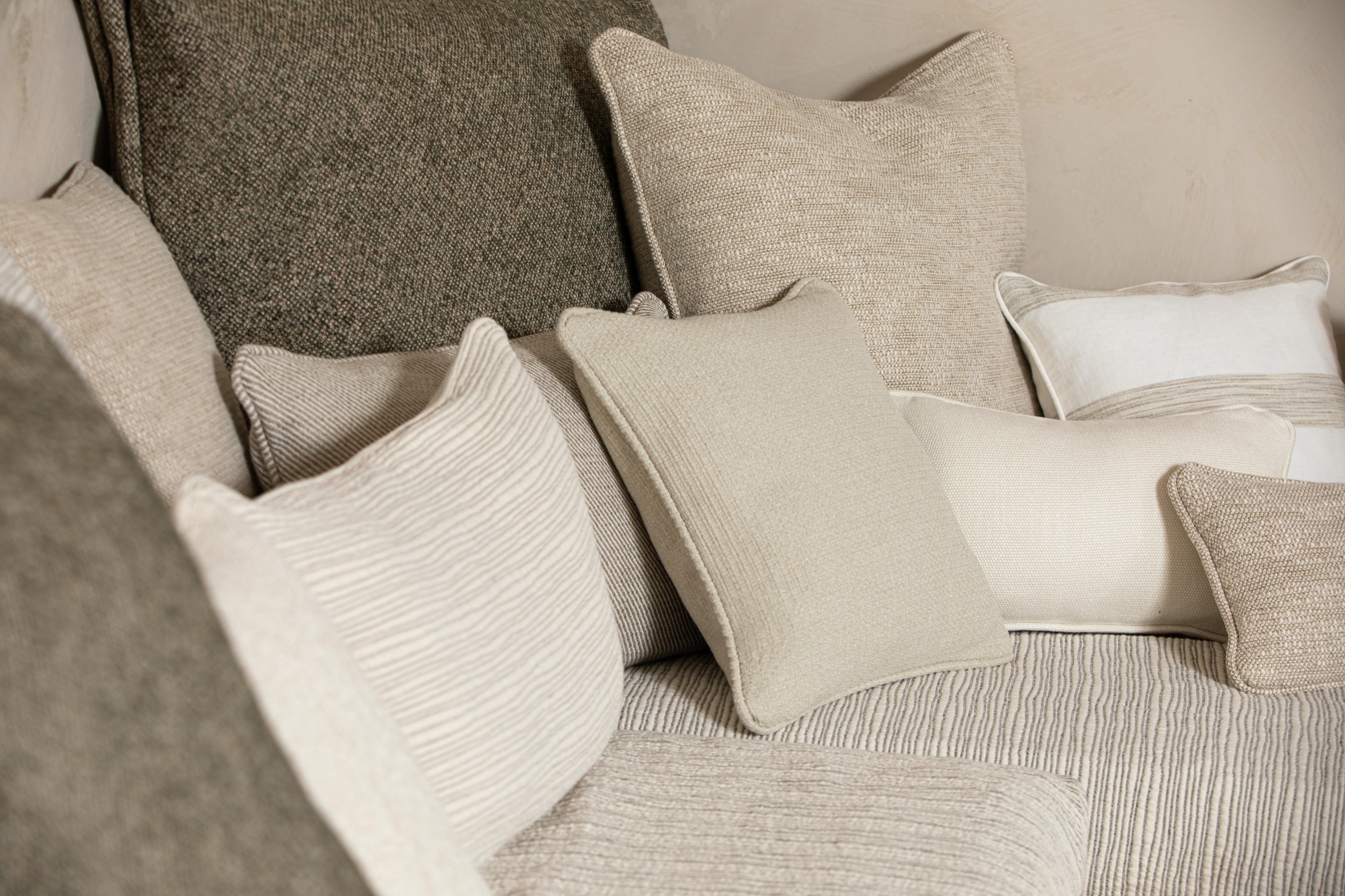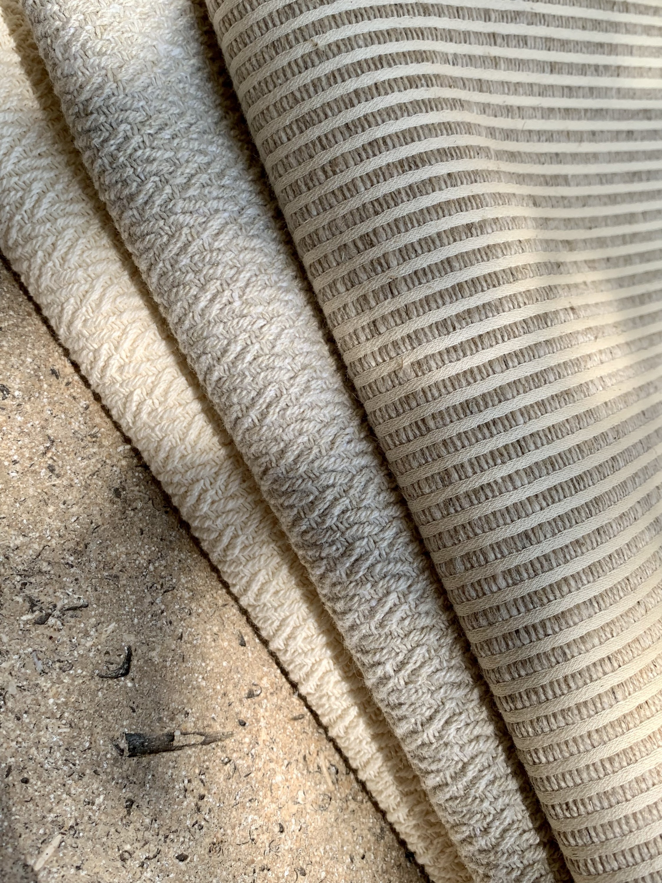 Trois étoffes font parfaitement écho aux enjeux circulaires soulevés par 100% Naturel : FORSYTHIA, HÉVÉA ET ÉPICÉA, composées à 100%de coton labellisé GRS - Global Recycled Standard - qui garantit des textiles composés avec un minimum de 50% de fibres recyclées. Une volonté pour Lelièvre de réduire la consommation de matières premières vierges et l'impact environnemental de ses produits. Proposés en deux couleurs (ficelle et écru), chaque tissu est décliné en trois dessins : chevron, rayures et un grain plus ample.