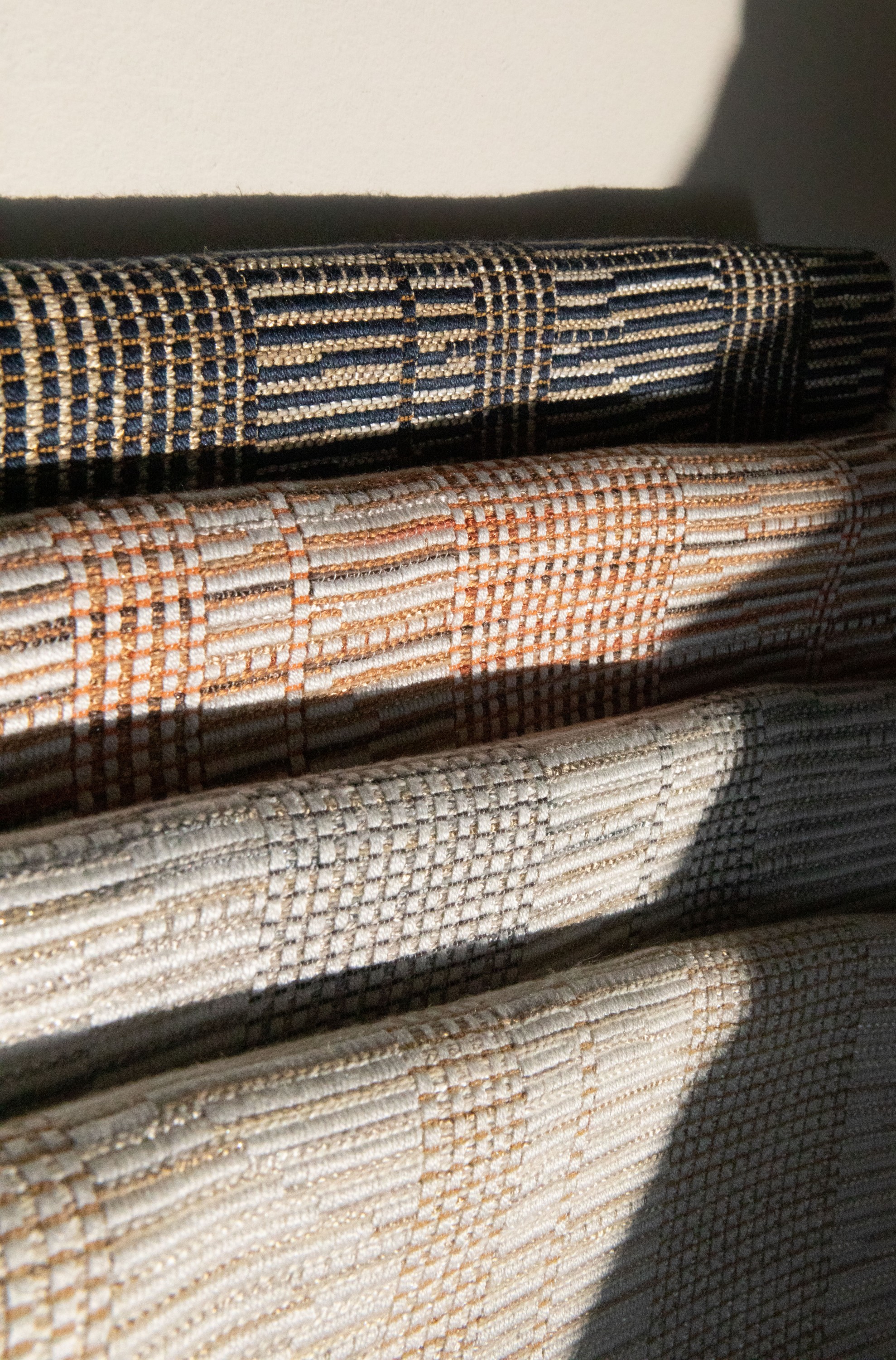 Avec ce jacquard d'une très belle main, SILLONS crée un sublime effet de rayures. Résultat d'un choix très minutieux de fils de trame, teints de plusieurs couleurs pour transmettre une irrégularité, presque aléatoire, via des stries verticales et horizontales.Ce tissu en coton mélangé joue avec les armures, les pixels, les lumières dans quatre variantes subtiles. | Design : Tristan Auer