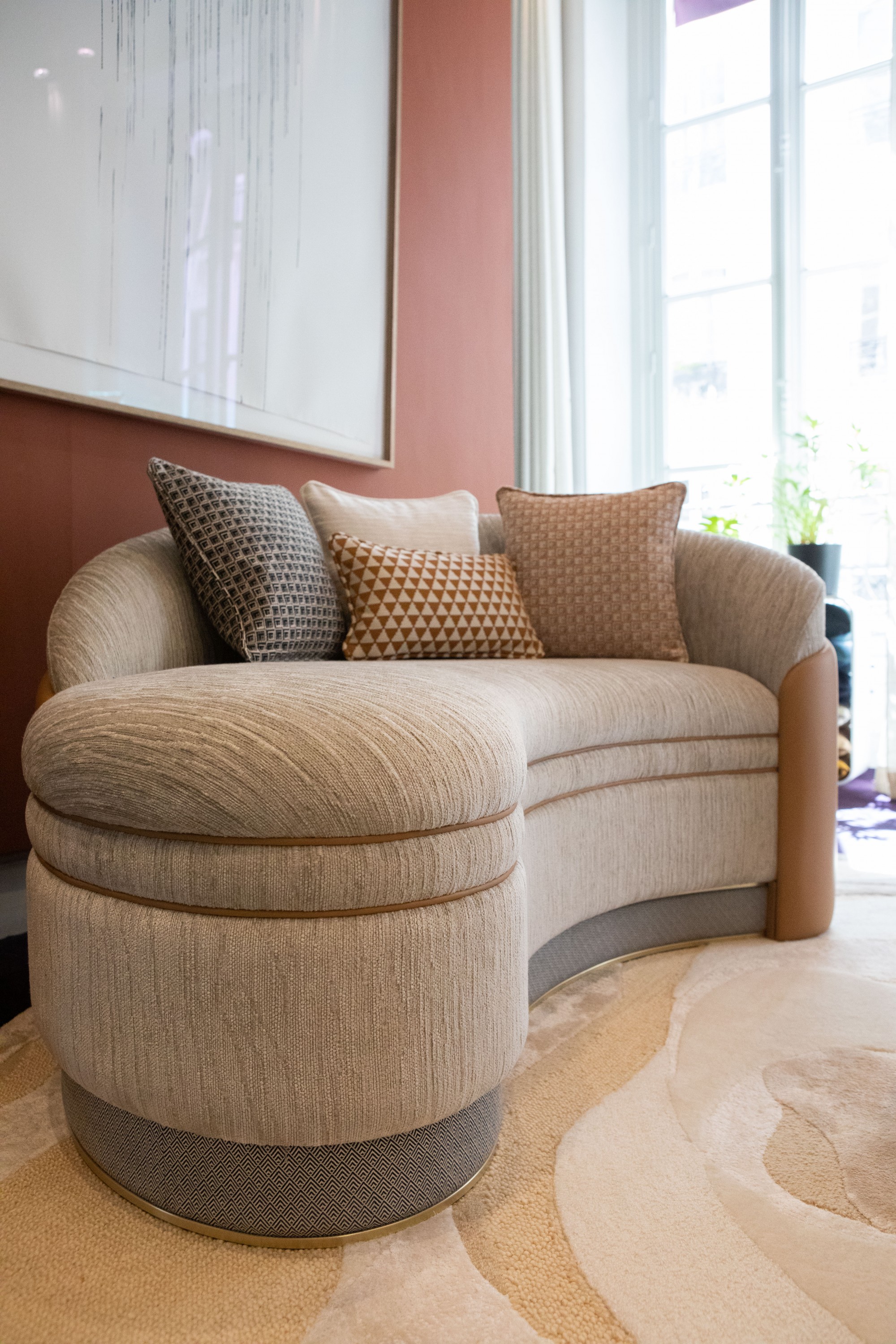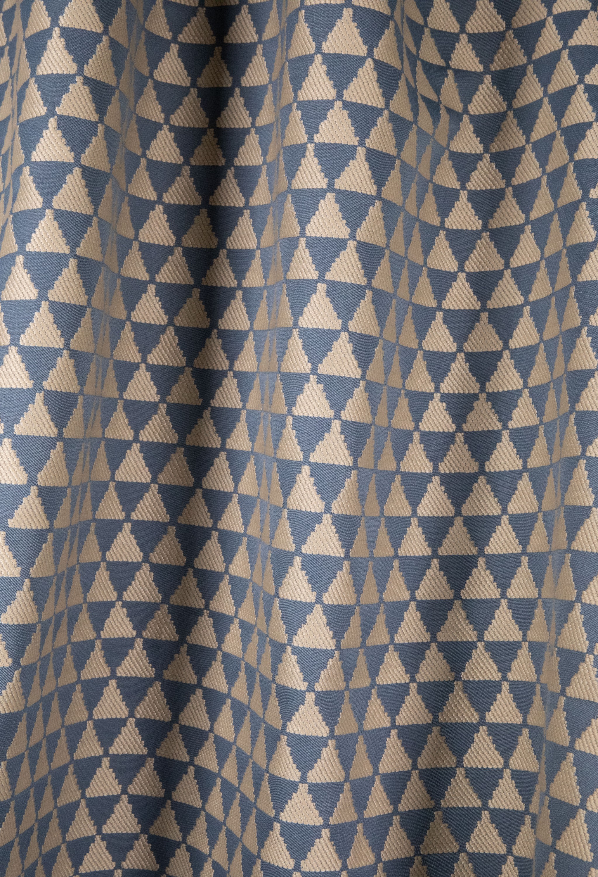 KHAÏMA (la "tente" en arabe, traditionnellement utilisée par les nomades dans les zones désertiques) est l'unique tissu haute performance de cette collection, en polyester au touché doux naturel. Du beige au marine en passant par le terracotta, il est proposé en six coloris ayant en commun une base naturelle sur laquelle le fil construit des motifs pyramidaux. | Design : Tristan Auer