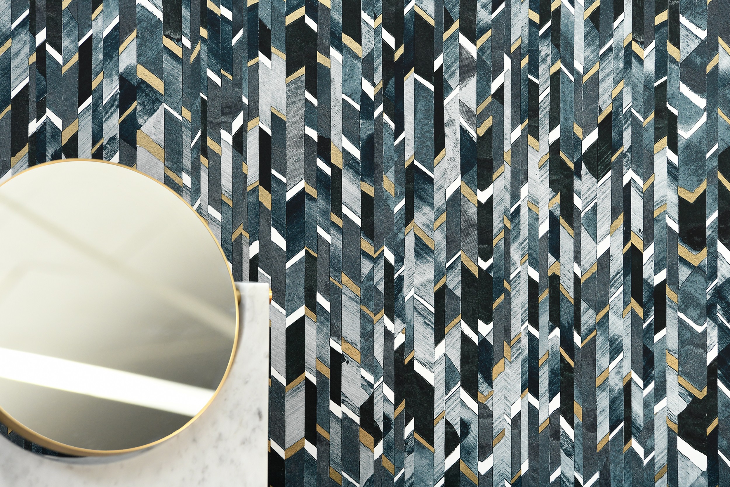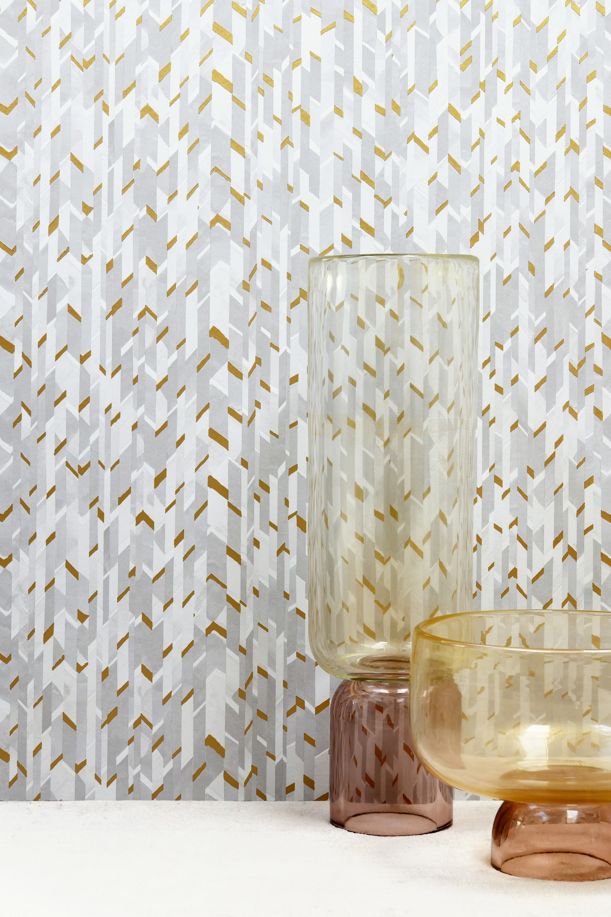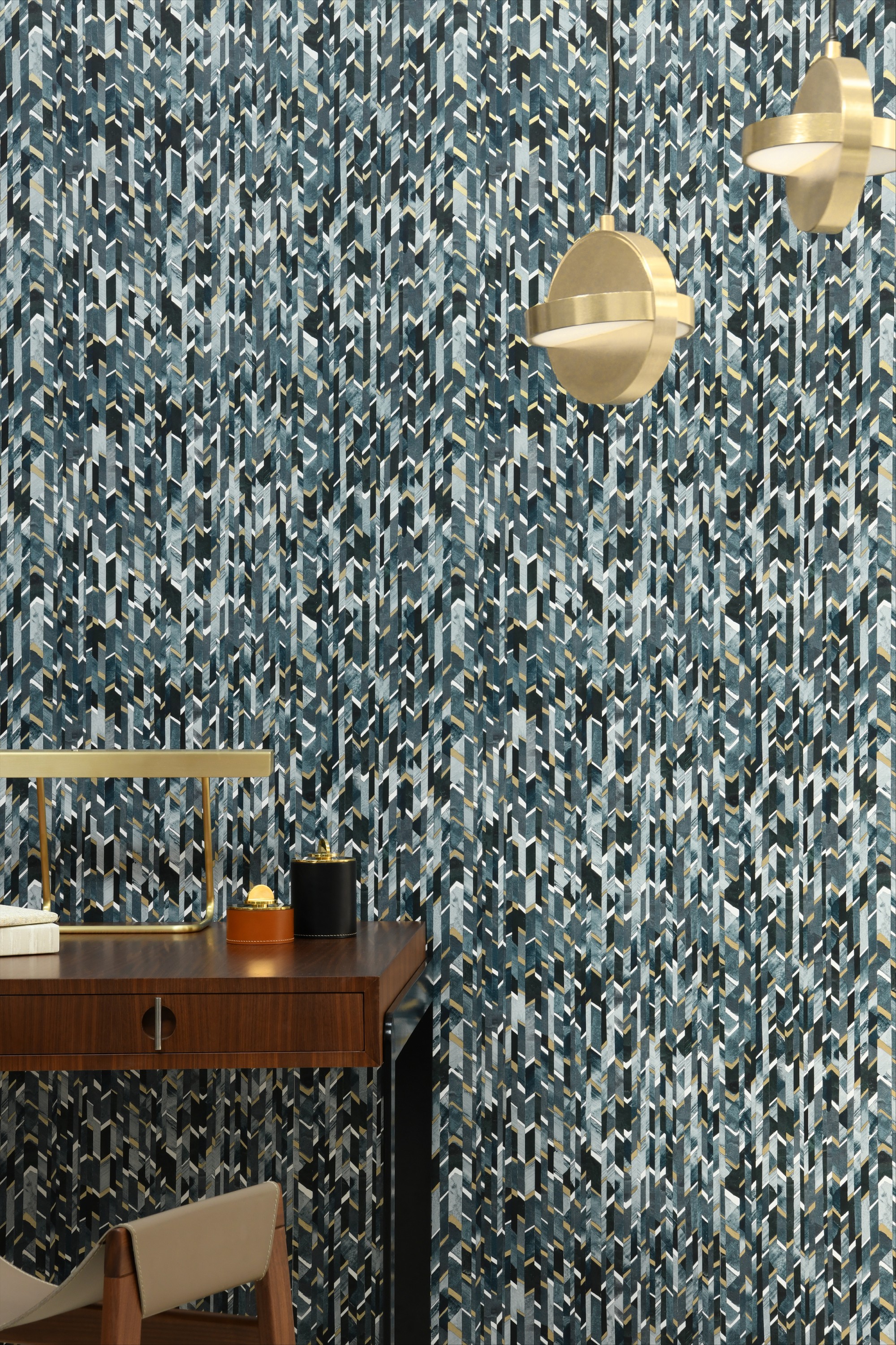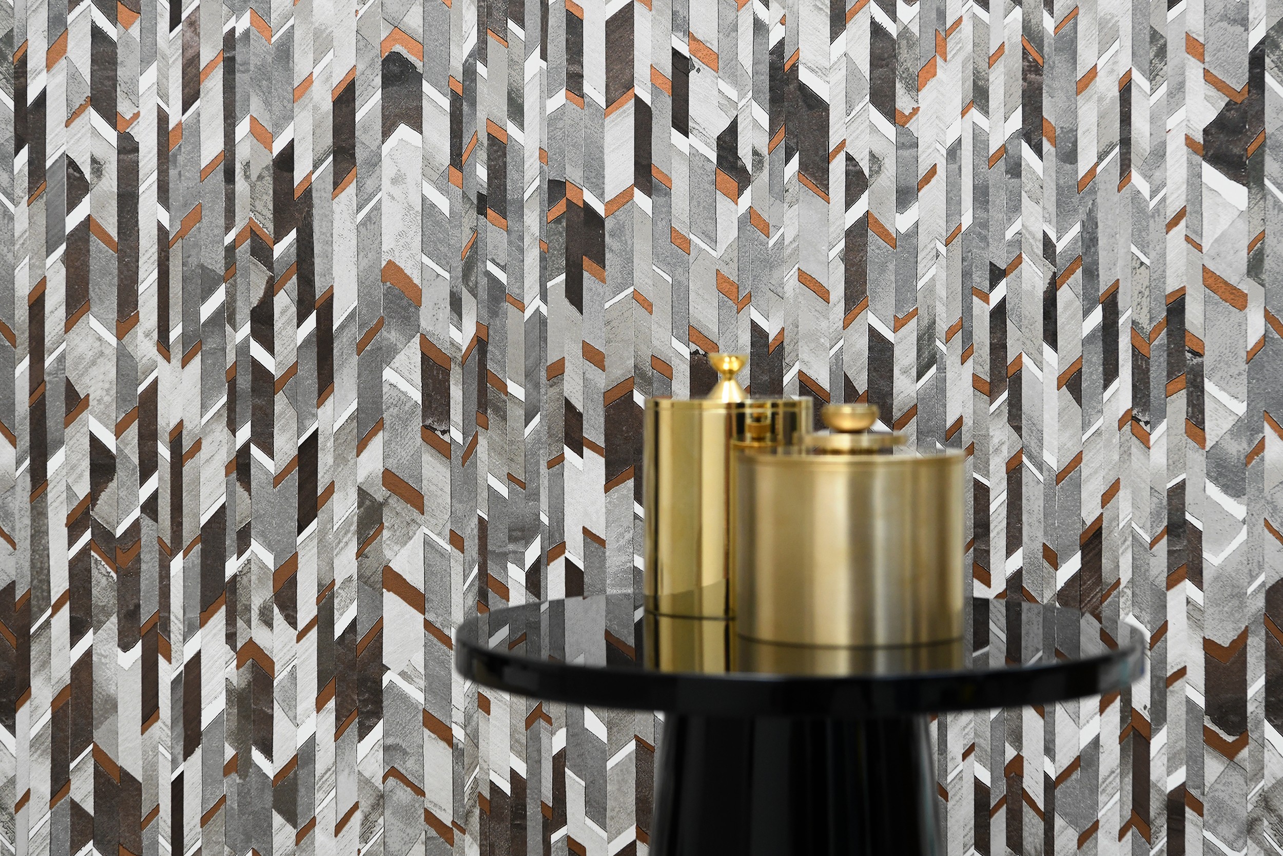 Création originale de la collection, marqueterie rend hommage à ce savoir-faire merveilleux aussi délicat que minutieux. De petites pièces s enchevêtrent en camaïeu de couleurs rehaussé d or ou de cuivre, créant un grand motif all over de chevron déstructuré.