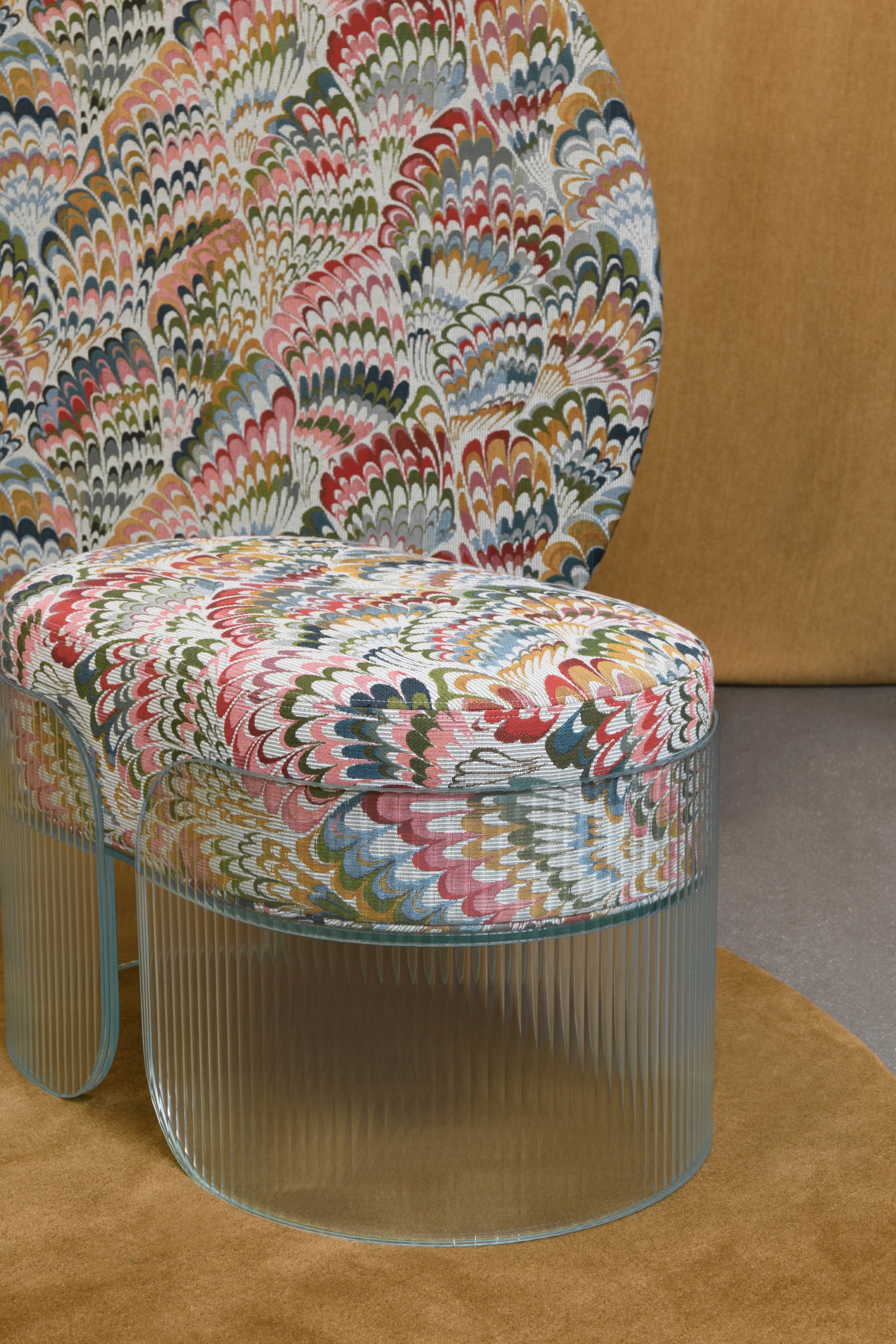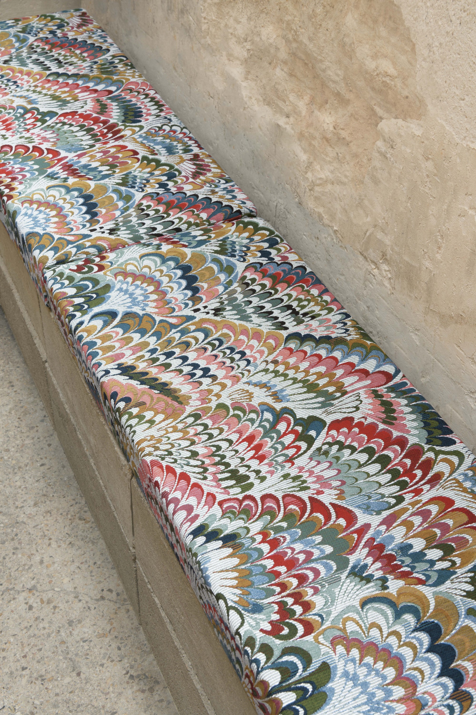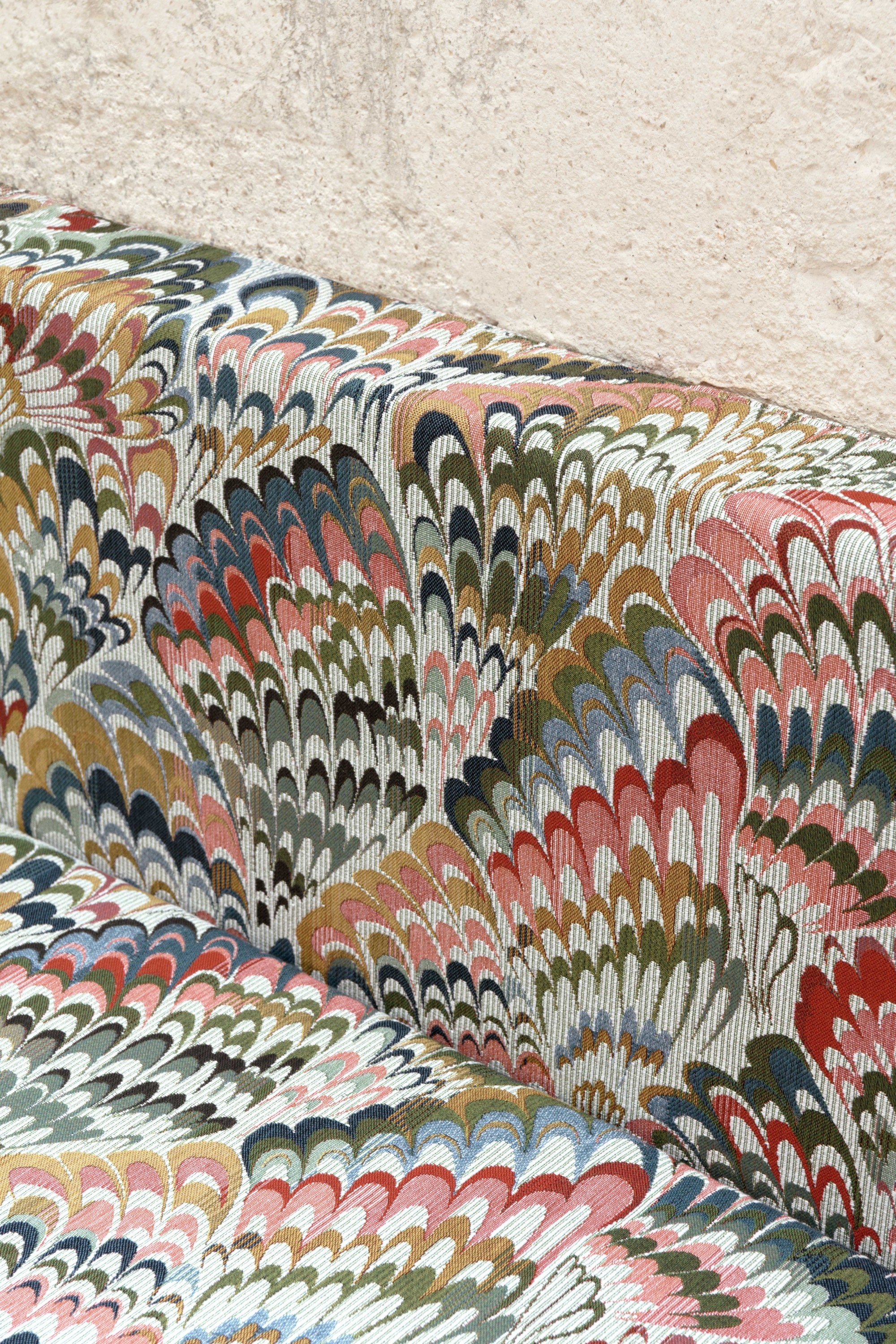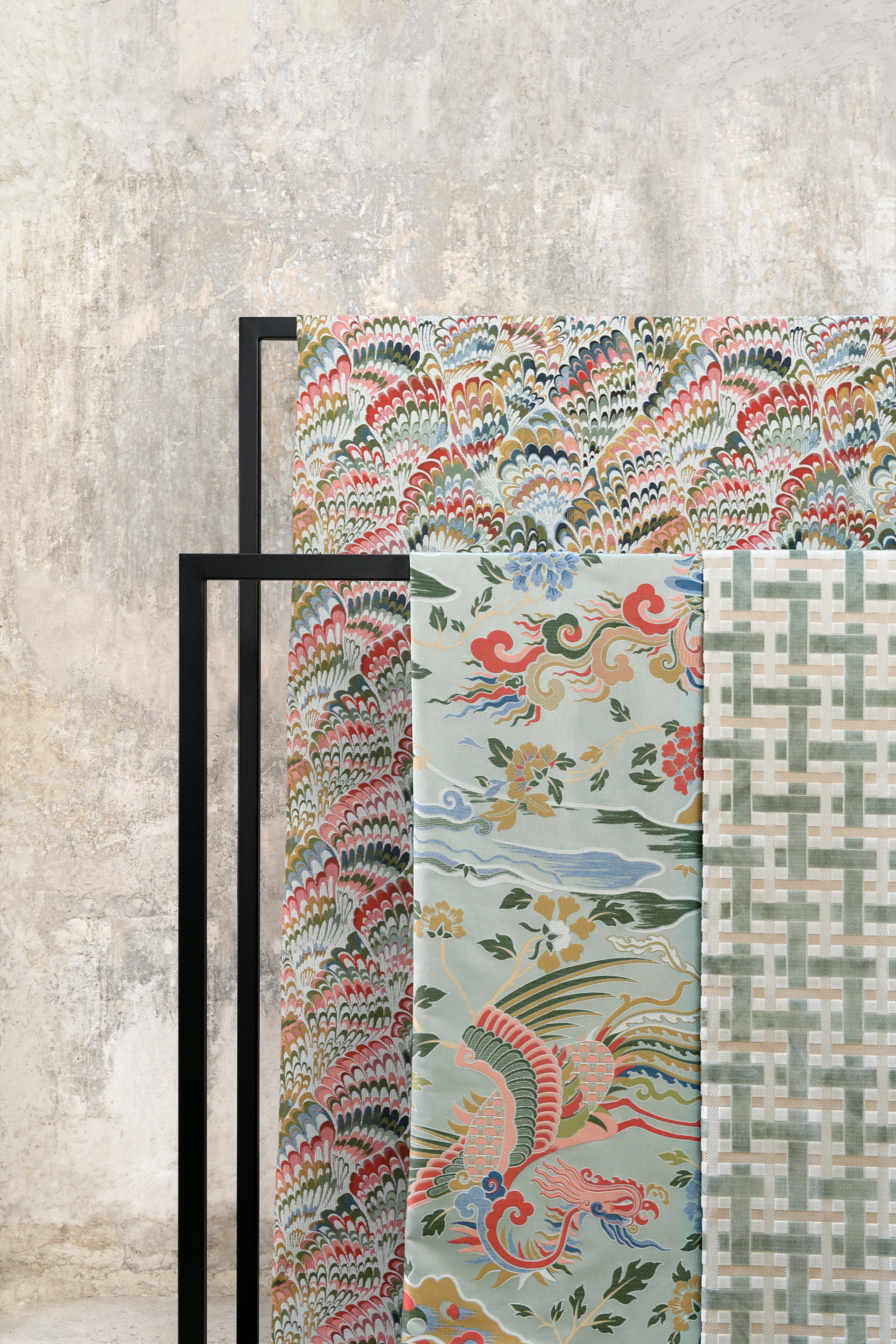 Au plus près du plumage de cet animal fantastique, cette tapisserie impressionnante de mise au point, sur un fond Ottoman, retranscrit tel un arc-en-ciel un plumage très stylisé dont la multitude d'armures vient donner du relief. 3 coloris : céladon, indigo, naturel.