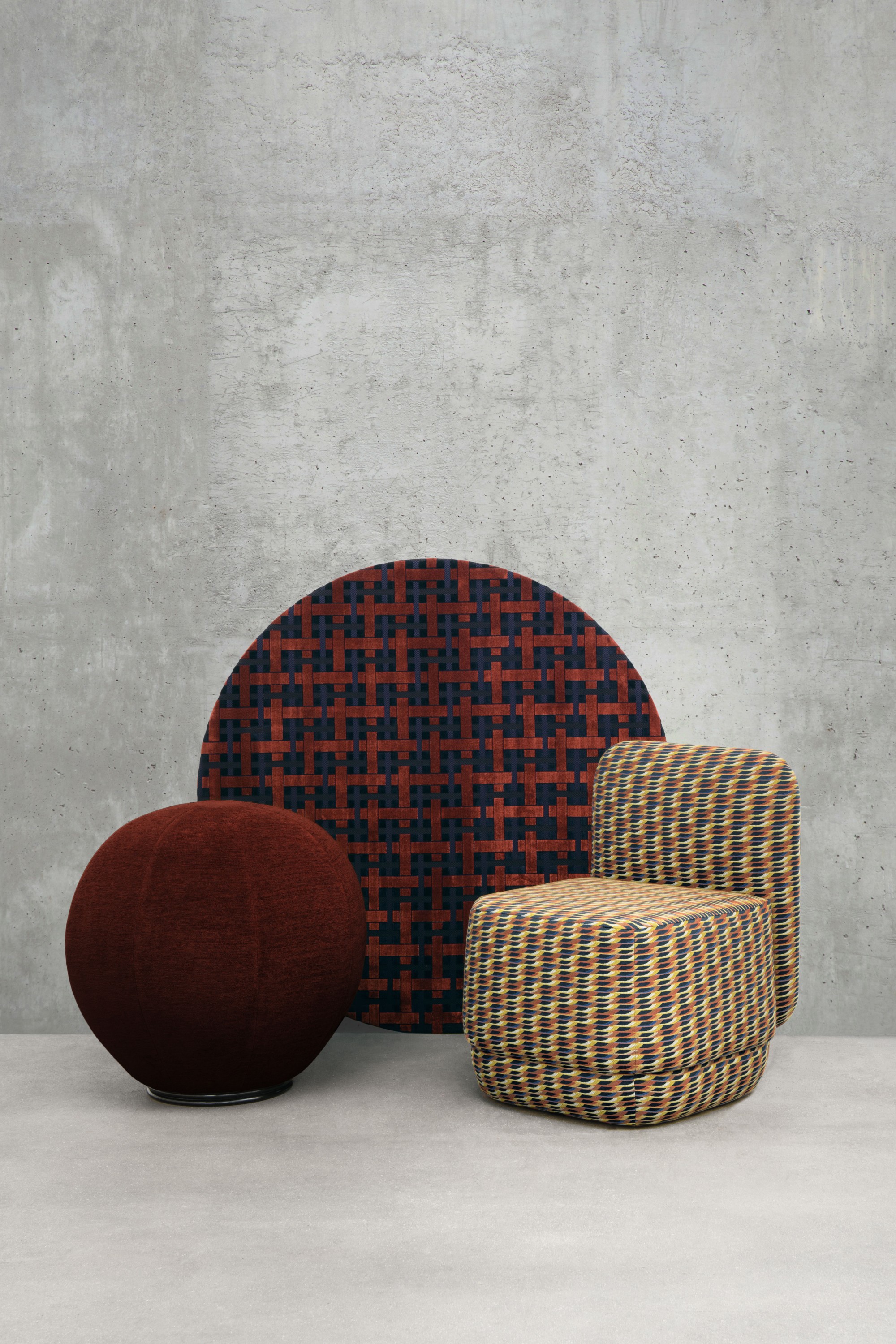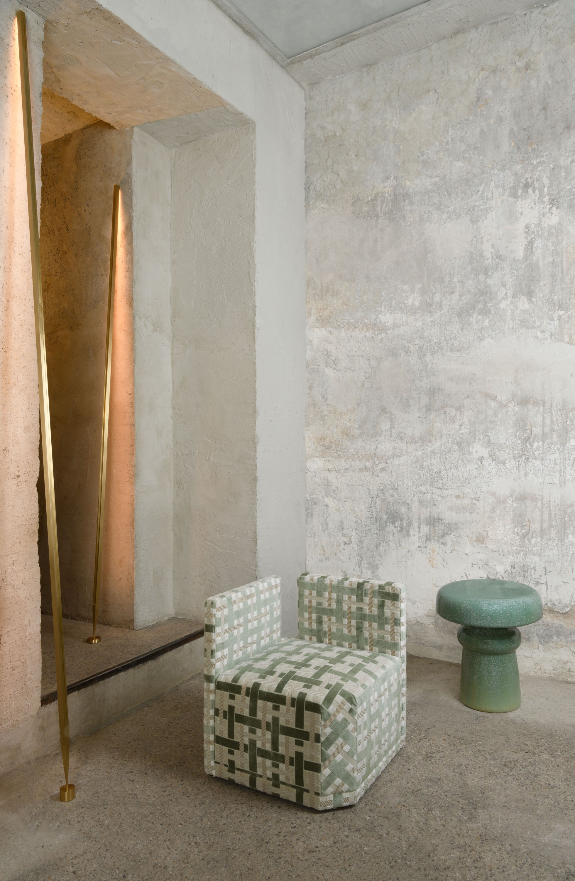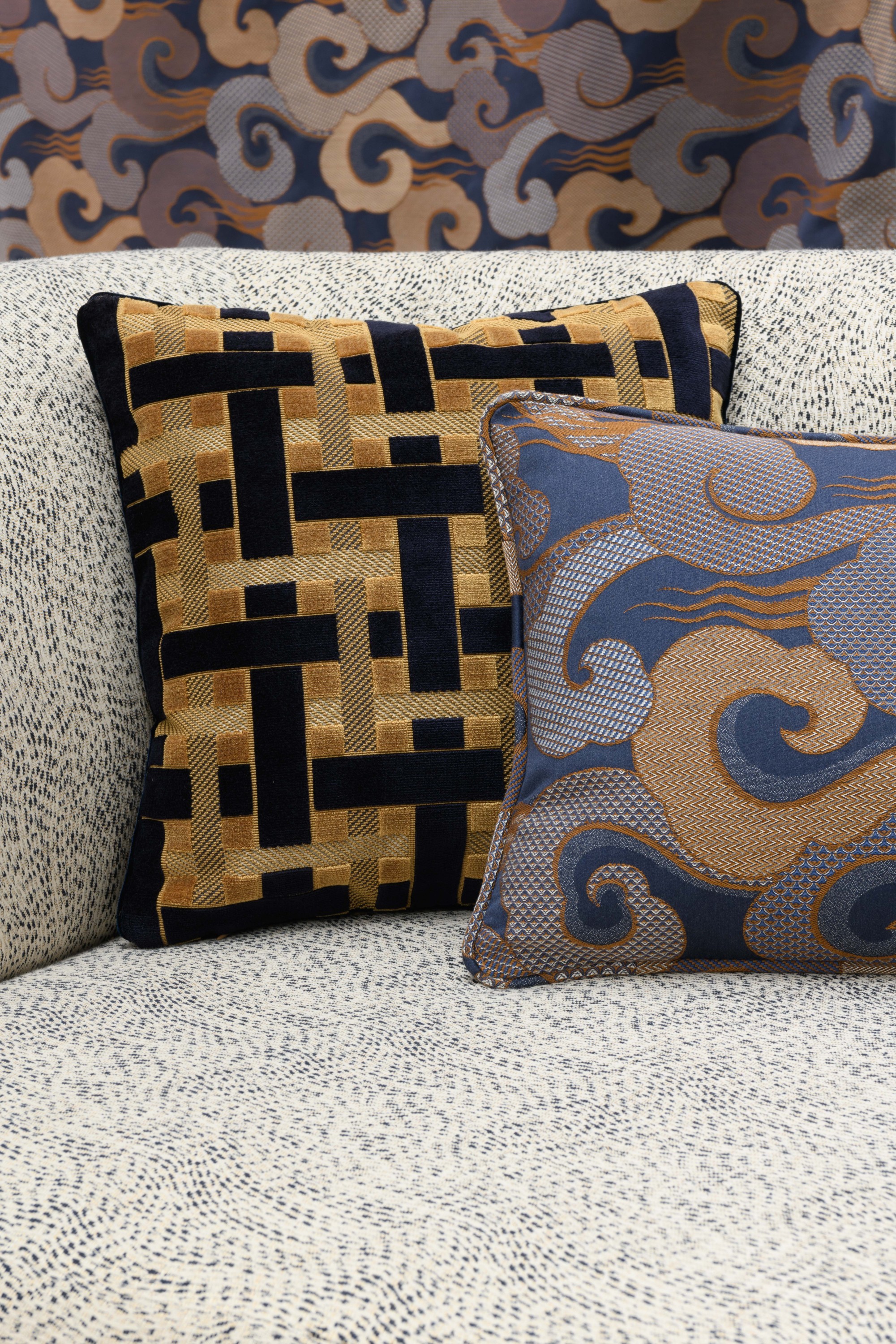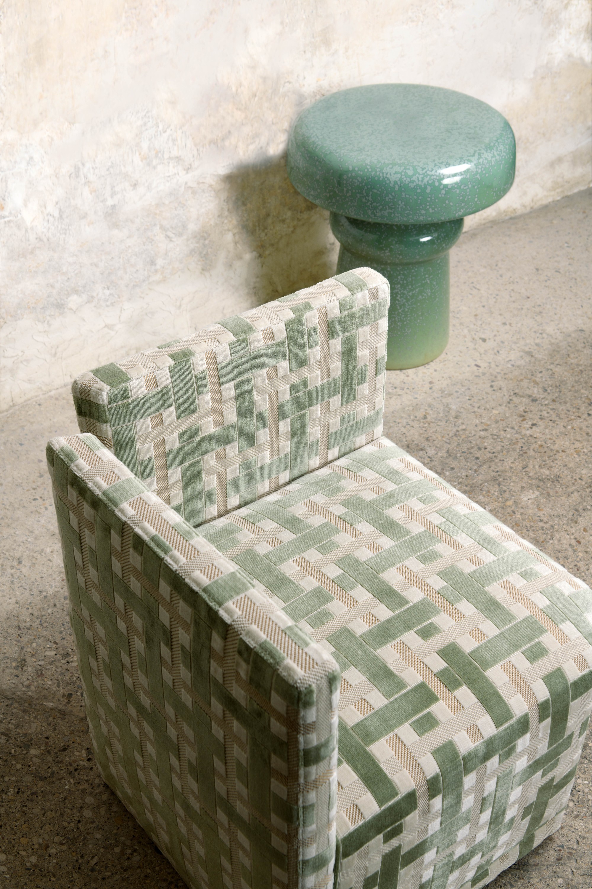 LACIS est un très beau velours épinglé qui laisse transparaître une très légère et subtile brillance, avec un fil de viscose mat. À la fois graphique et géométrique, ce tissu laisse transparaître un tressage, un entrelacs de rubans qui n'est pas sans évoquer le tartan qui vient contraster et s'accorder parfaitement avec la collection L'Envolée Fantastique.