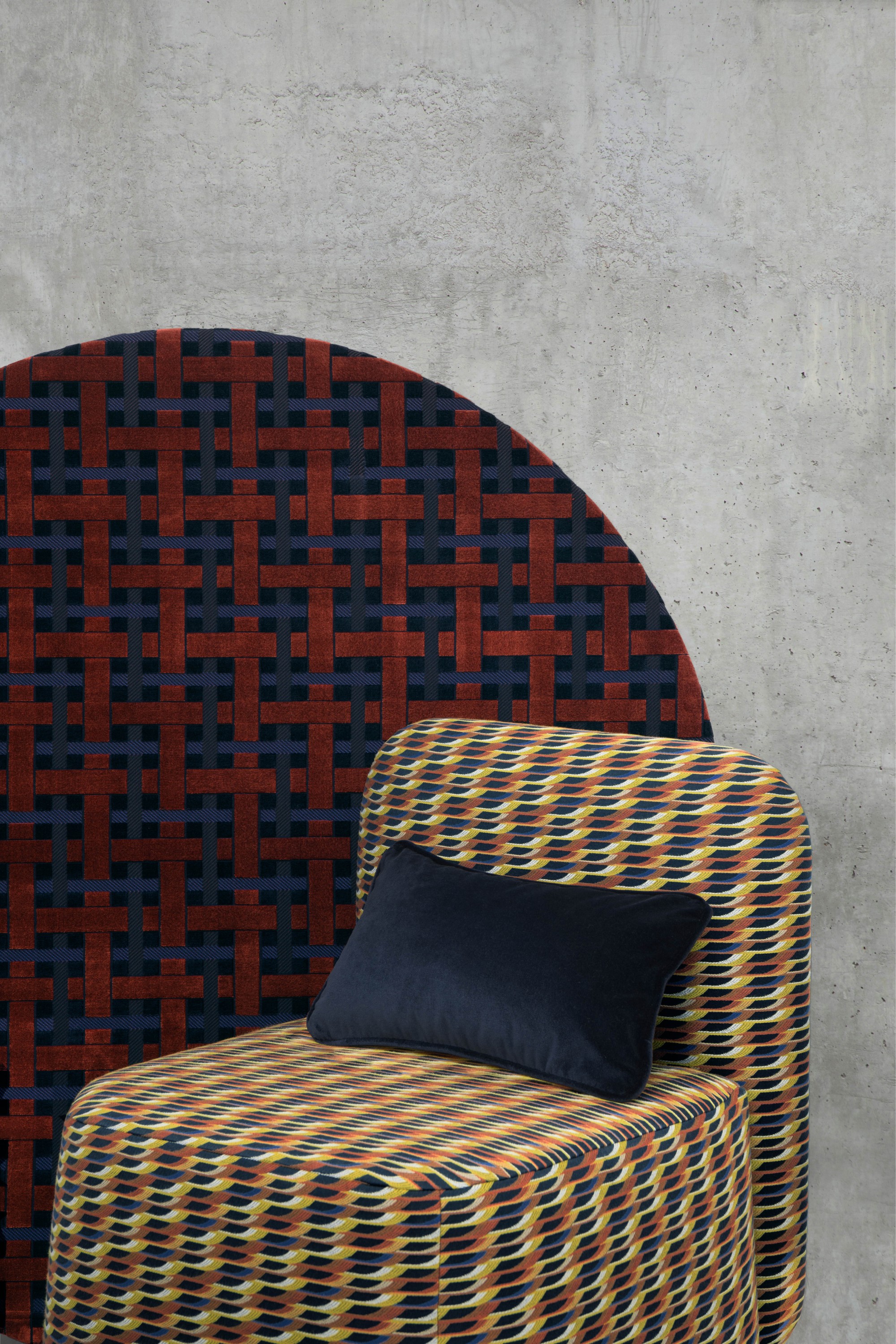 On appelle "alula" une partie du plumage de l'aile d'un oiseau. Ce petit jacquard, inspiré des plumages graphiques du grand jacquard, a été conçu et travaillé en camaïeu multicolore pour donner un effet de plume stylisée. 6 coloris : naturel, céladon, blush, sauge, indigo, ambre.