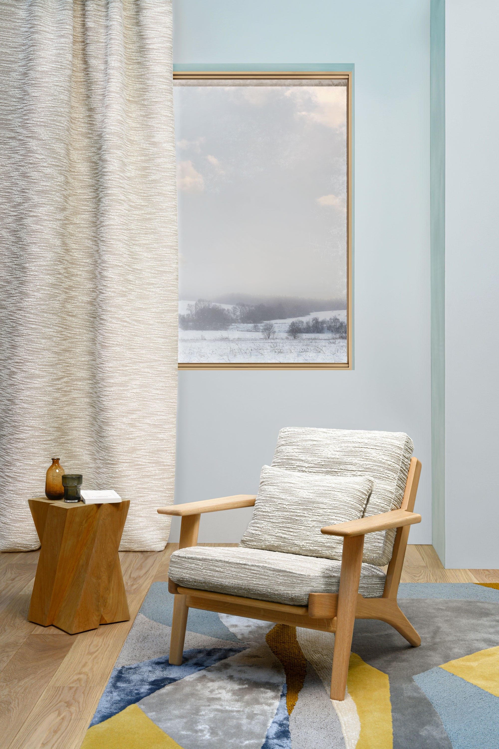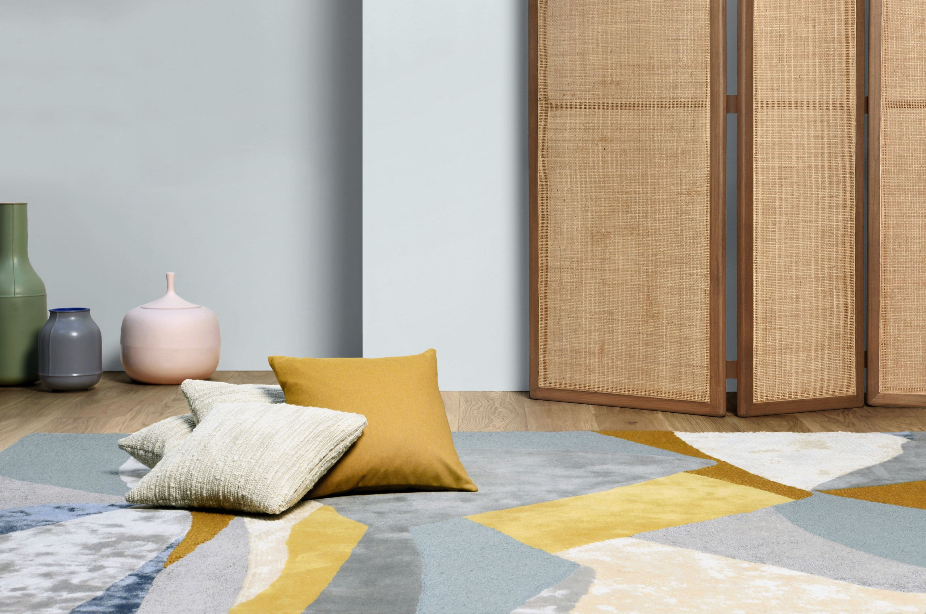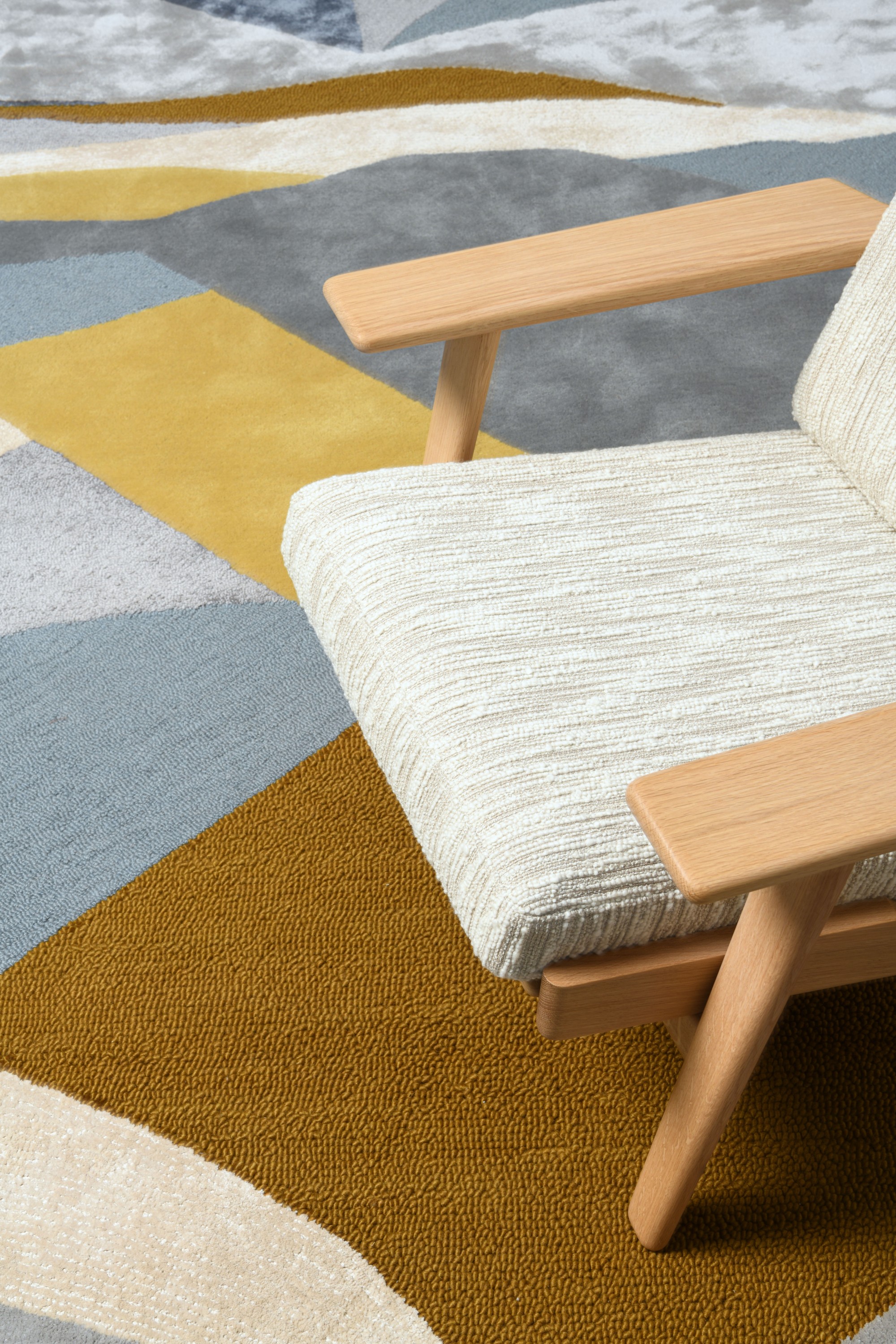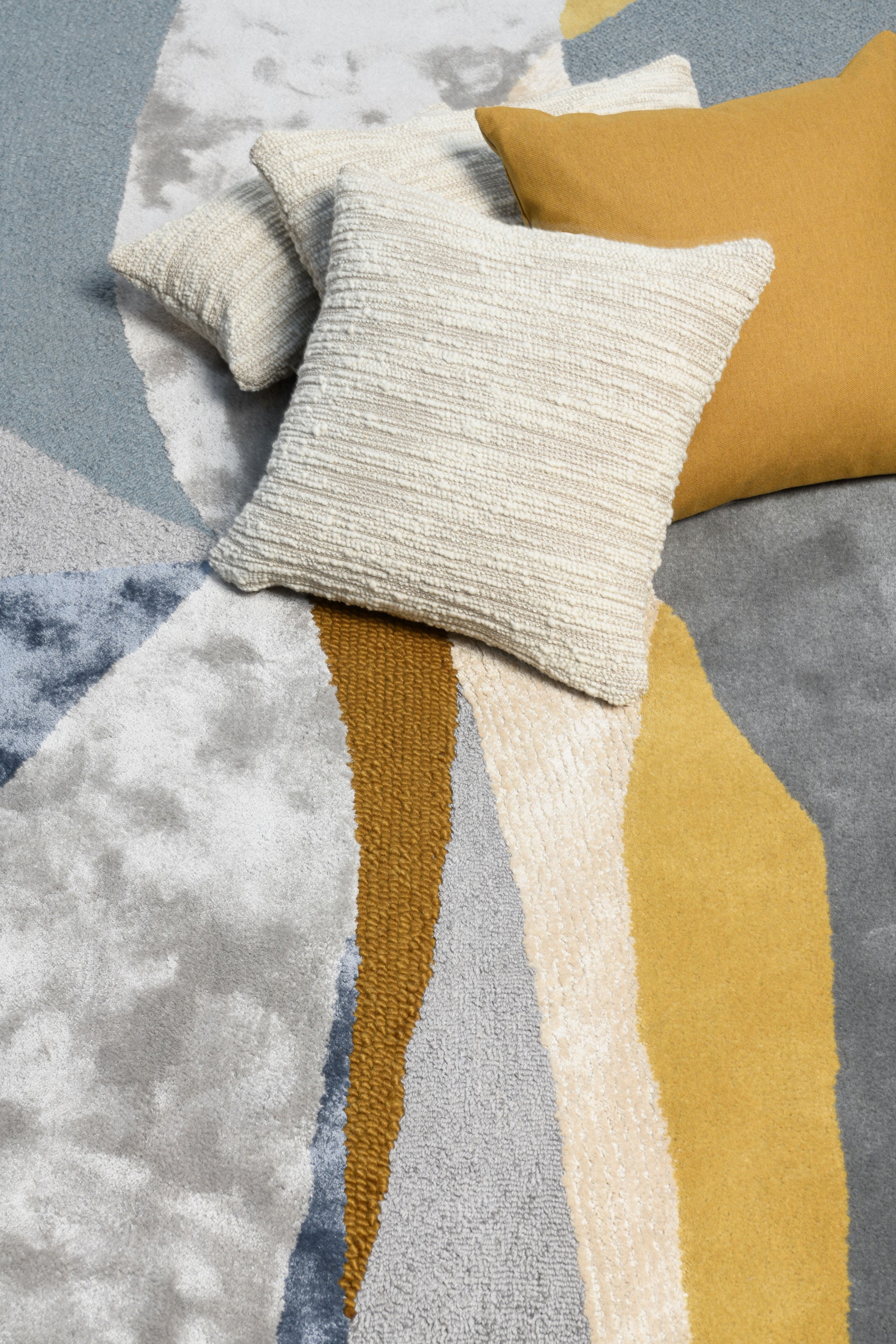 Inspiré de la tapisserie phare ALTITUDE de la collection Signature BOREALIS, cet élégant tapis évoque un paysage sous la gelée matinale. Sublimé par 8 teintes coordonnées allant du bleu jusqu'au gris bleuté et réchauffé par des jaunes, écrus et ocres. Un jeu de mat et de brillant et de ciselages rappelle parfaitement les terres gelées. Tufté à la main, il associe de fines boucles à des boucles plus amples et une hauteur de poils qui vient souligner les aspérités du paysage, les aplats de tuft rappellent quant à eux les plaines.