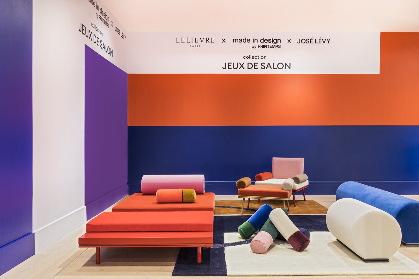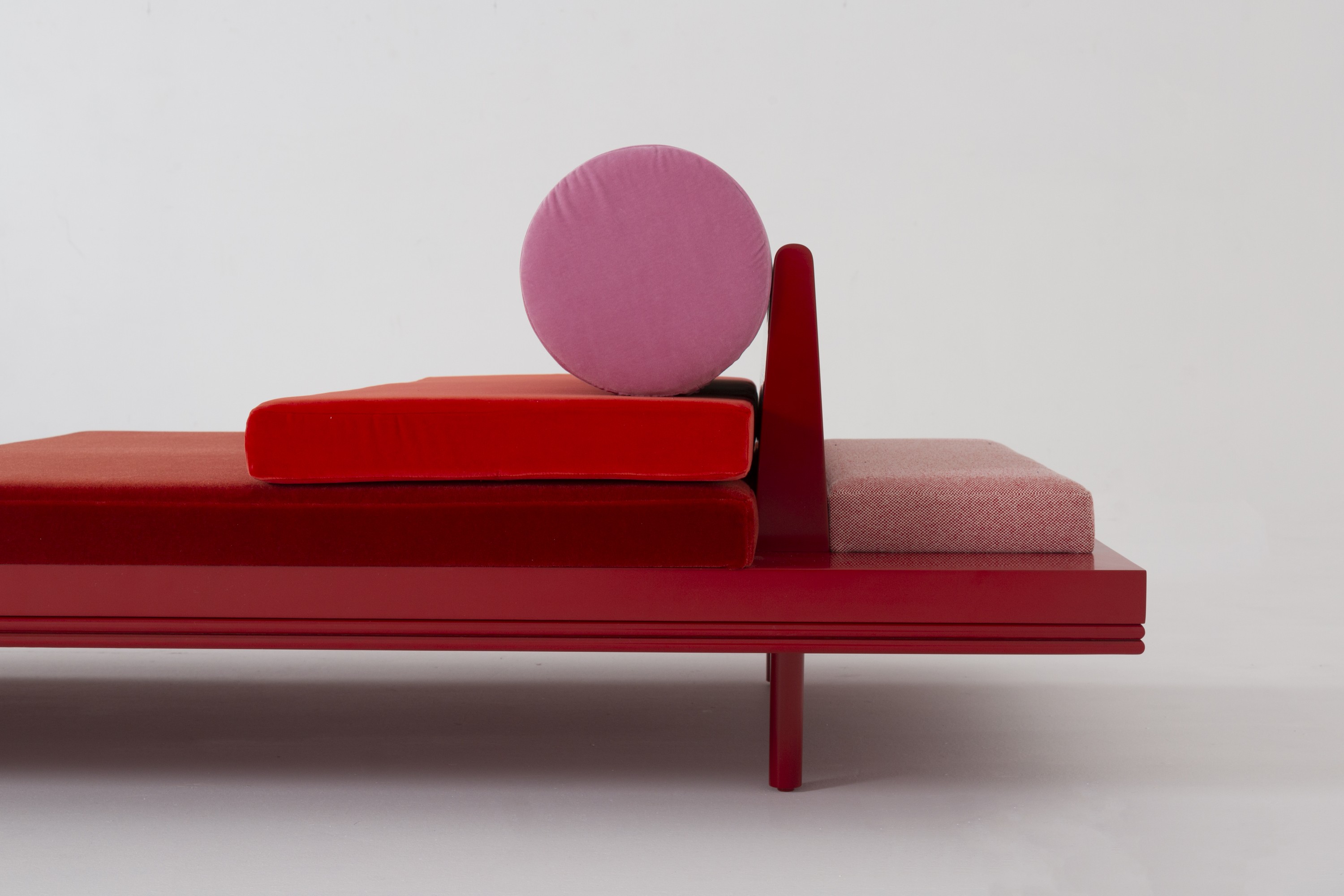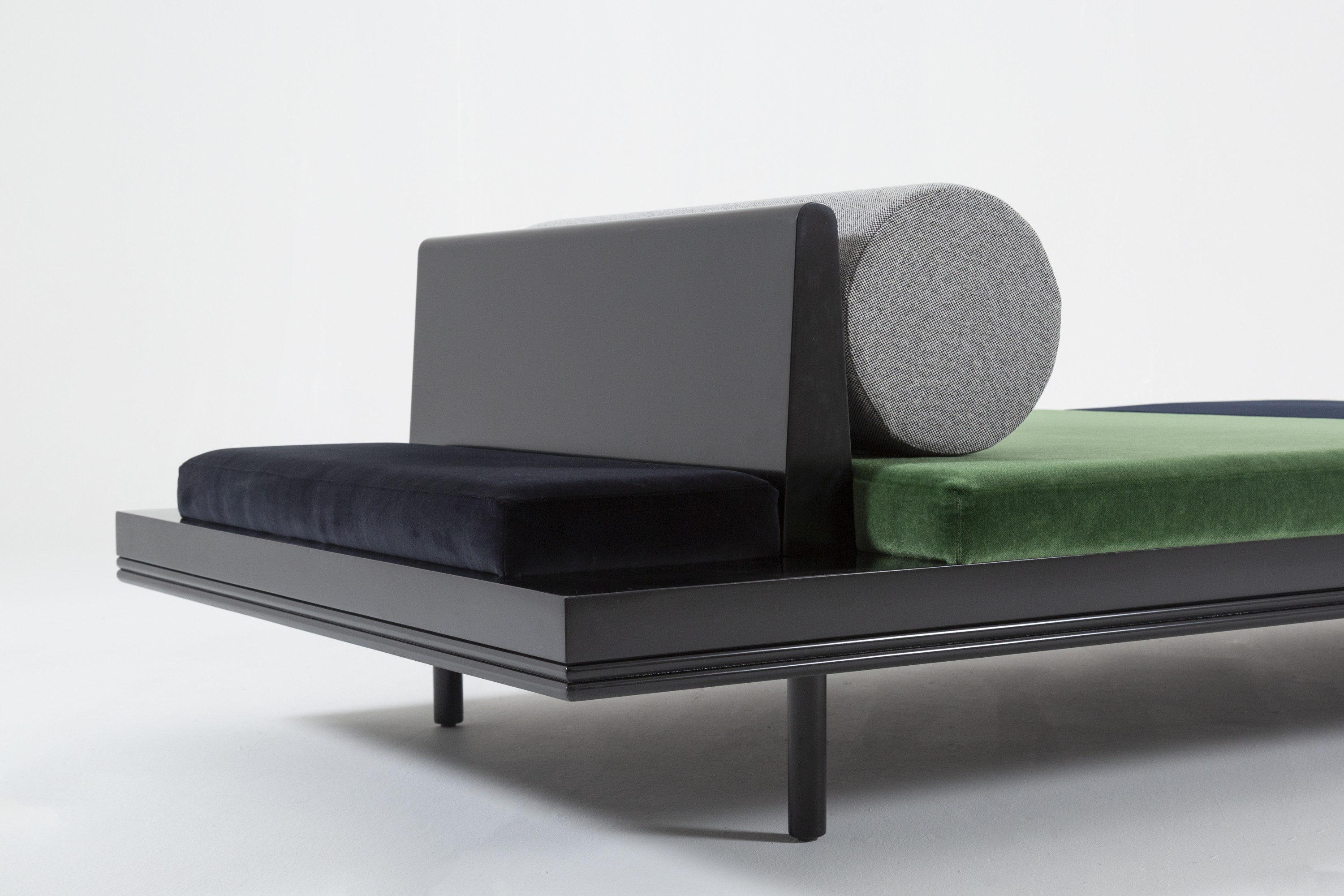 Divan en frêne. Mousse CH MR répondant aux normes non feu AM18. Disponible en bois laqué noir, bois laqué rouge et bois miellé. | Poids : 70 kg | Tissus : Lana, Cosmos, Chaulnes ou Sherpas | Design : José Lévy