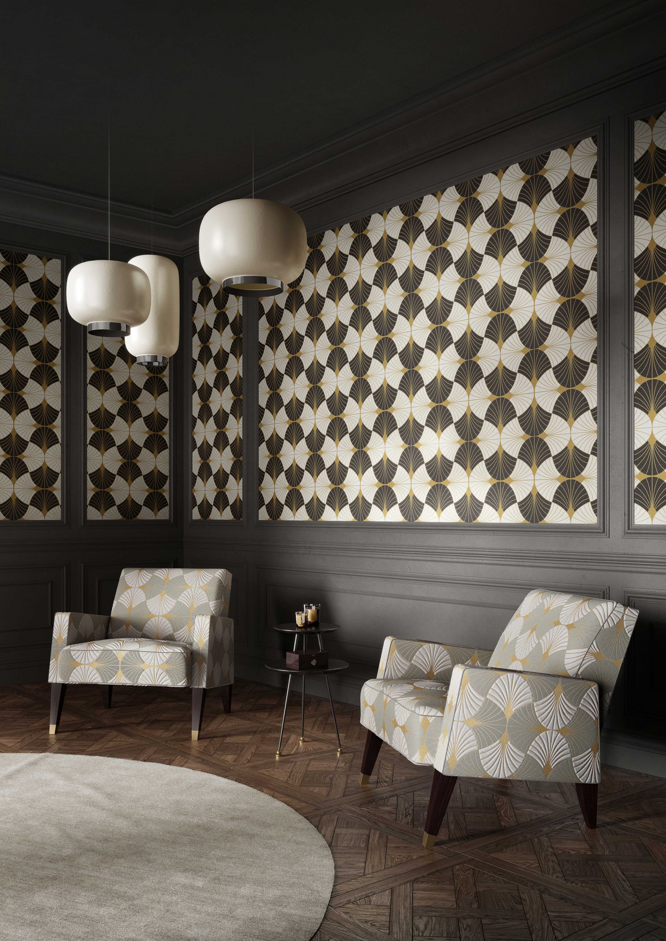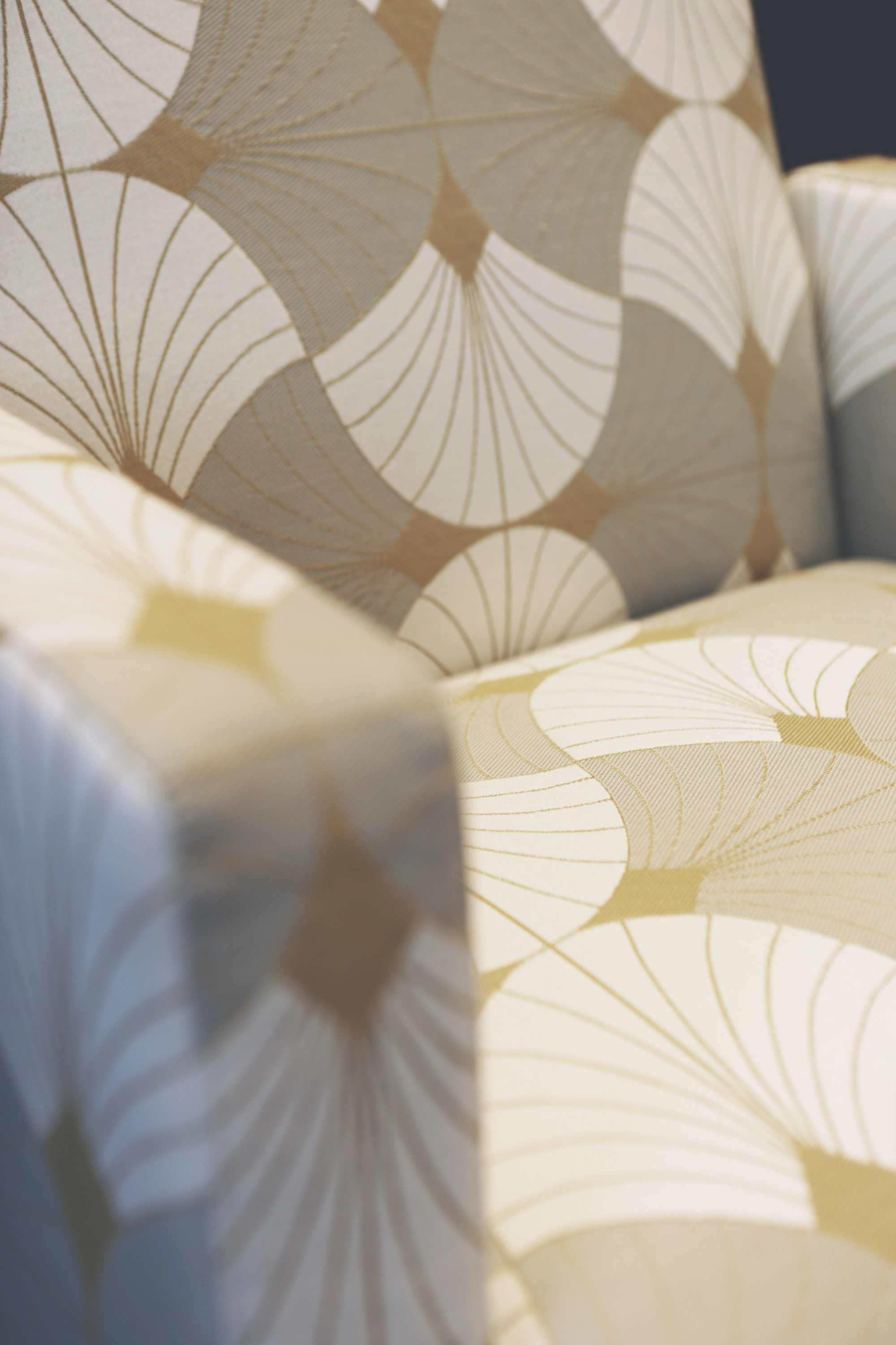 FLABELLA is a Jacquard fabric woven with a linen thread that creates a swollen, heavy Brocade-like effect. Contrasting bright Indigowith a very elegant deep shade of black, it features a highly decorative pattern inspired by an unmistakable Art Deco motif. Changes in the weave pattern and the combination of tonal colours deliver a very modern feel, for a spectacular result on drapes! FLABELLA is manufactured at the Lelièvre factory near Lyon, France. | Design: Maison Leleu