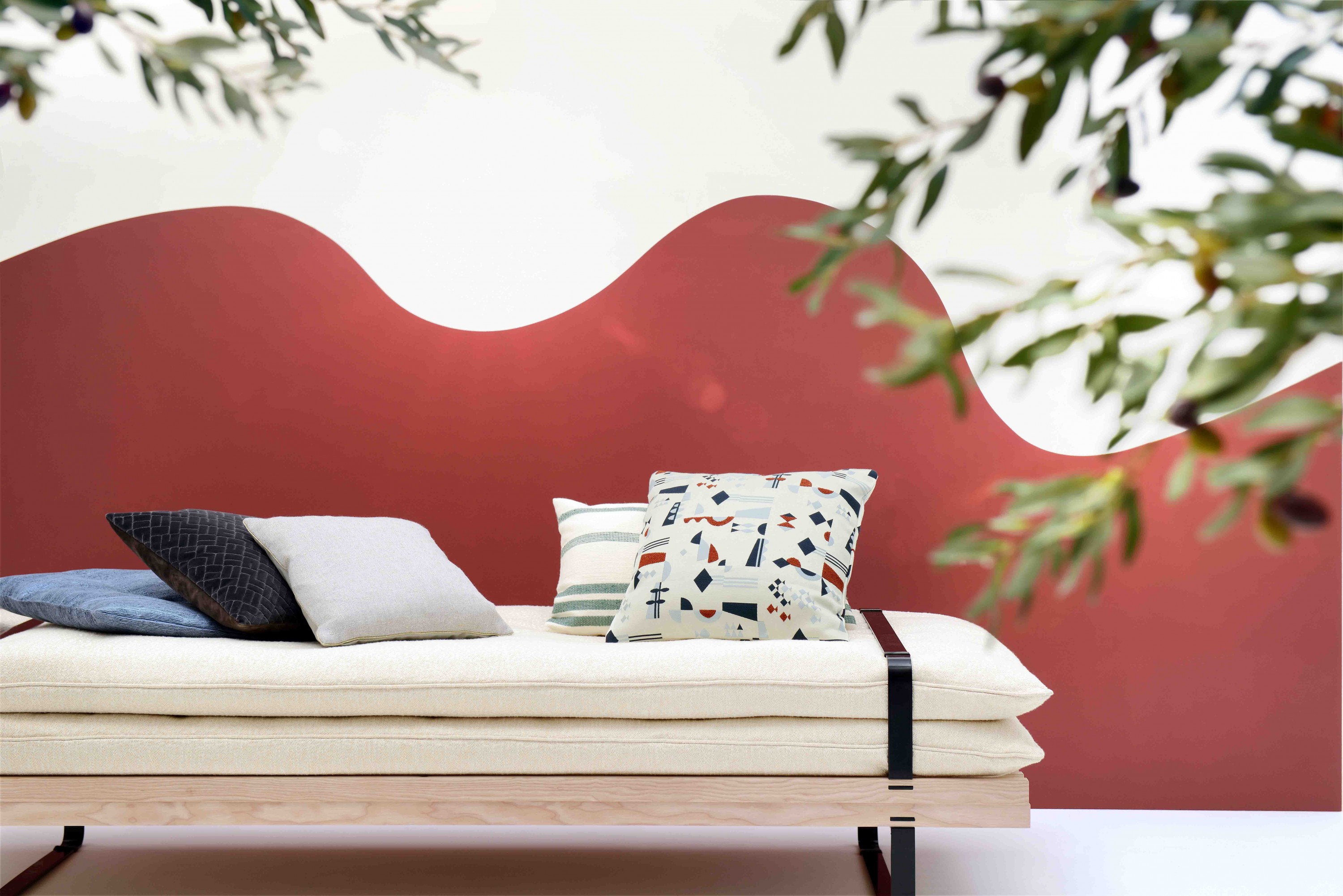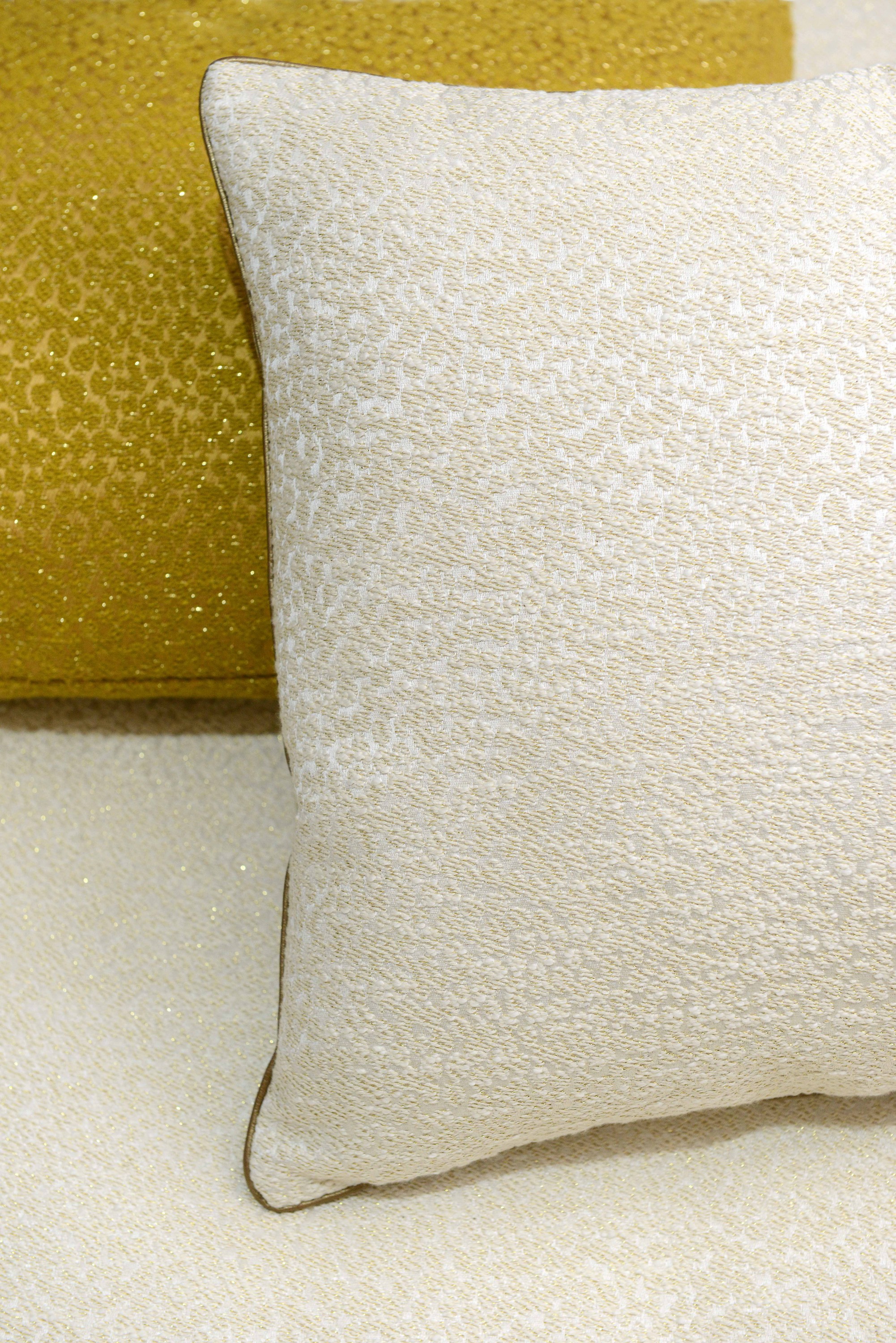 The colours of a path lit by the sun... Each embossed design is an interpretation of the plants and minerals encountered during walks on wild and arid trails. The gold that delicately accentuates this fabric in a soft loop thread echoes the colours of the Mediterranean sunshine.
