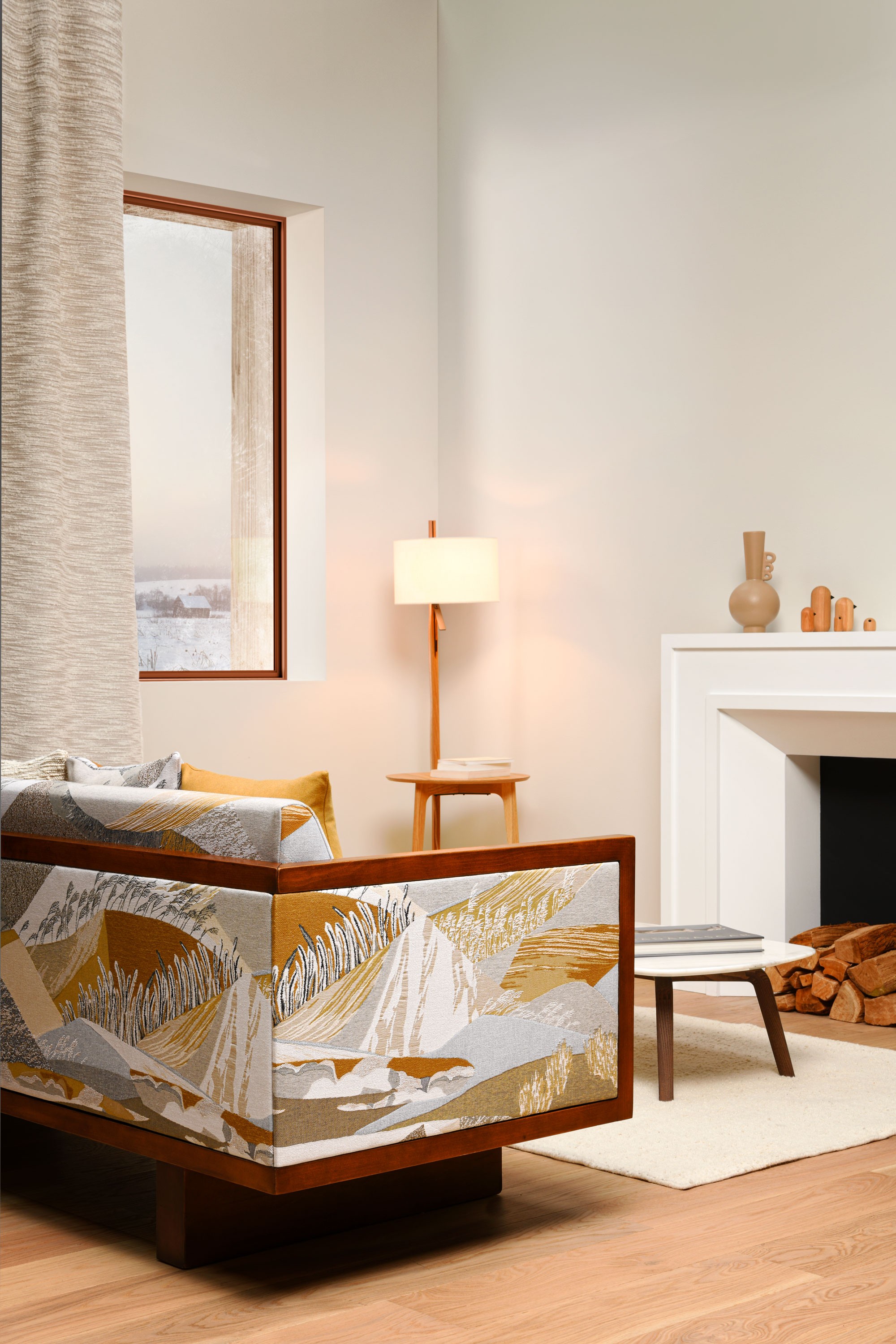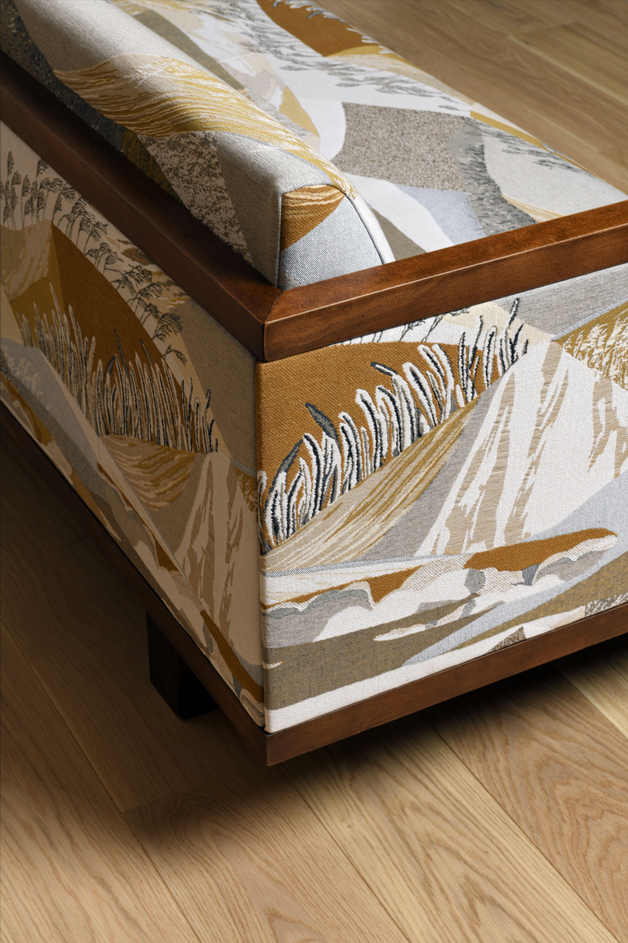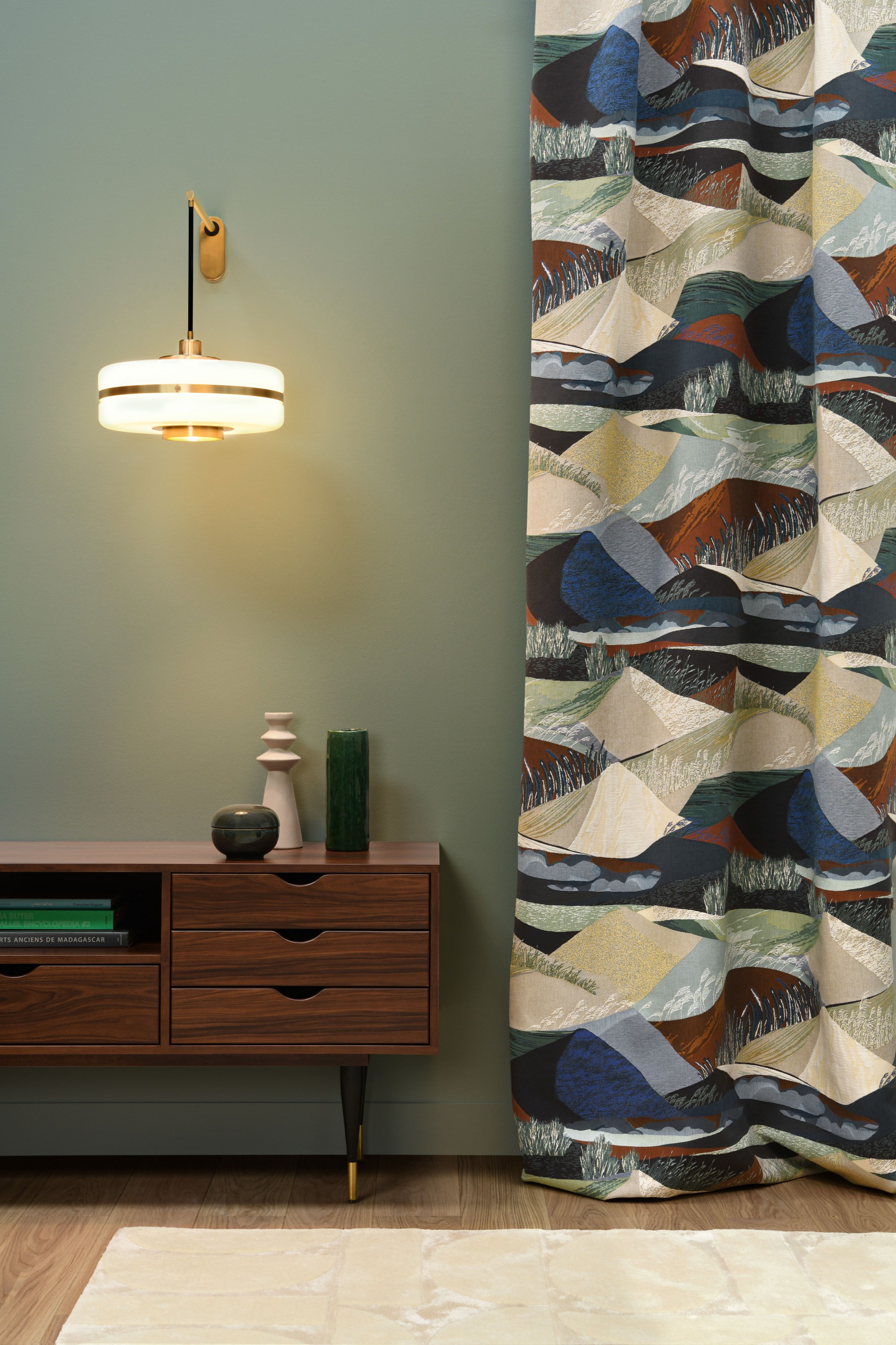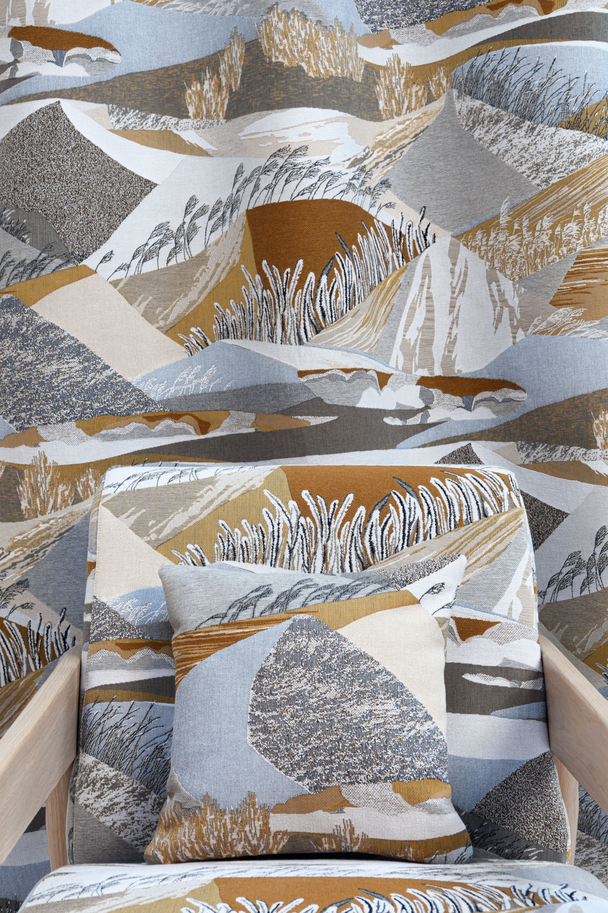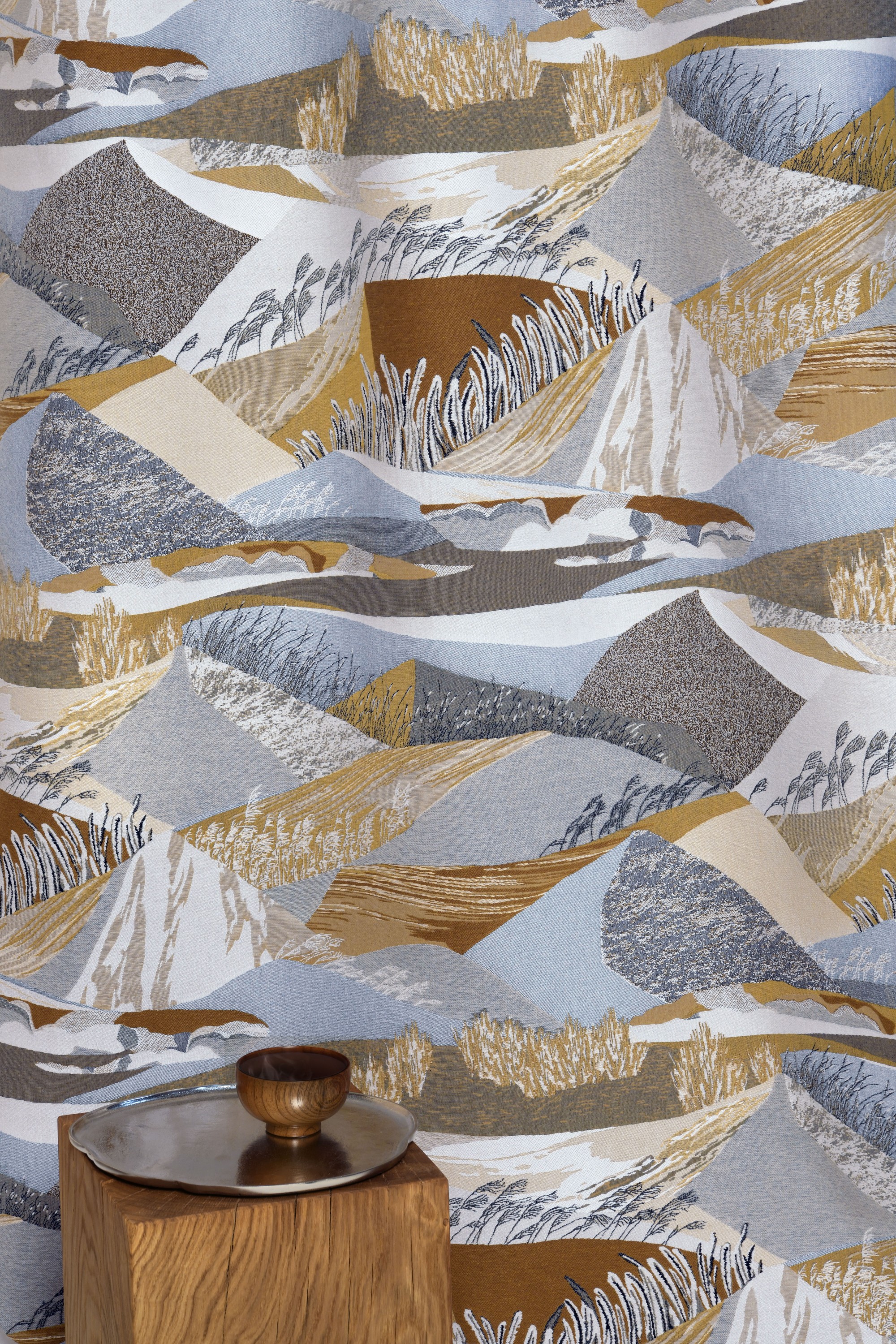 ALTITUDE is the masterpiece of the BOREALIS collection, a spectacular tapestry boasting a subtle blend of figurative and stylised contemporary motifs. It draws inspiration from typical Scandinavian scenery, depicted in a pictorial fashion. The result is a highly contemplative design. In a feat of craftsmanship, the outstanding weave work brings out every detail, emphasising volume, contributing to a sense of refinement and movement. the fabric features a distinctively high repeat. Available in two colours: Glacier consists of natural tones, white with warmer ochre accents for a stunning interplay with natural light. Crépuscule displays bolder colours - celadon, indigo, cognac - in an evocation of the darker hours before nightfall.